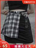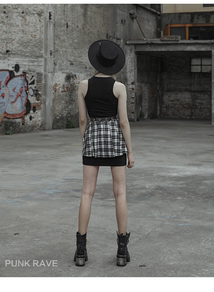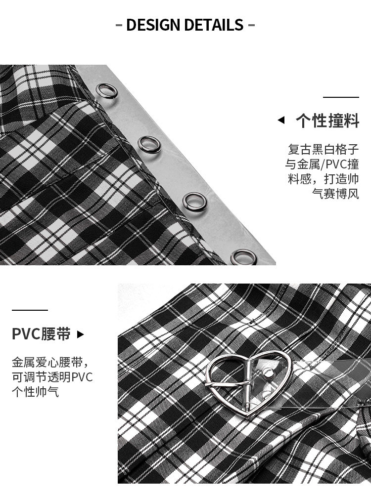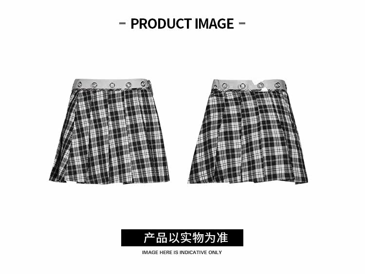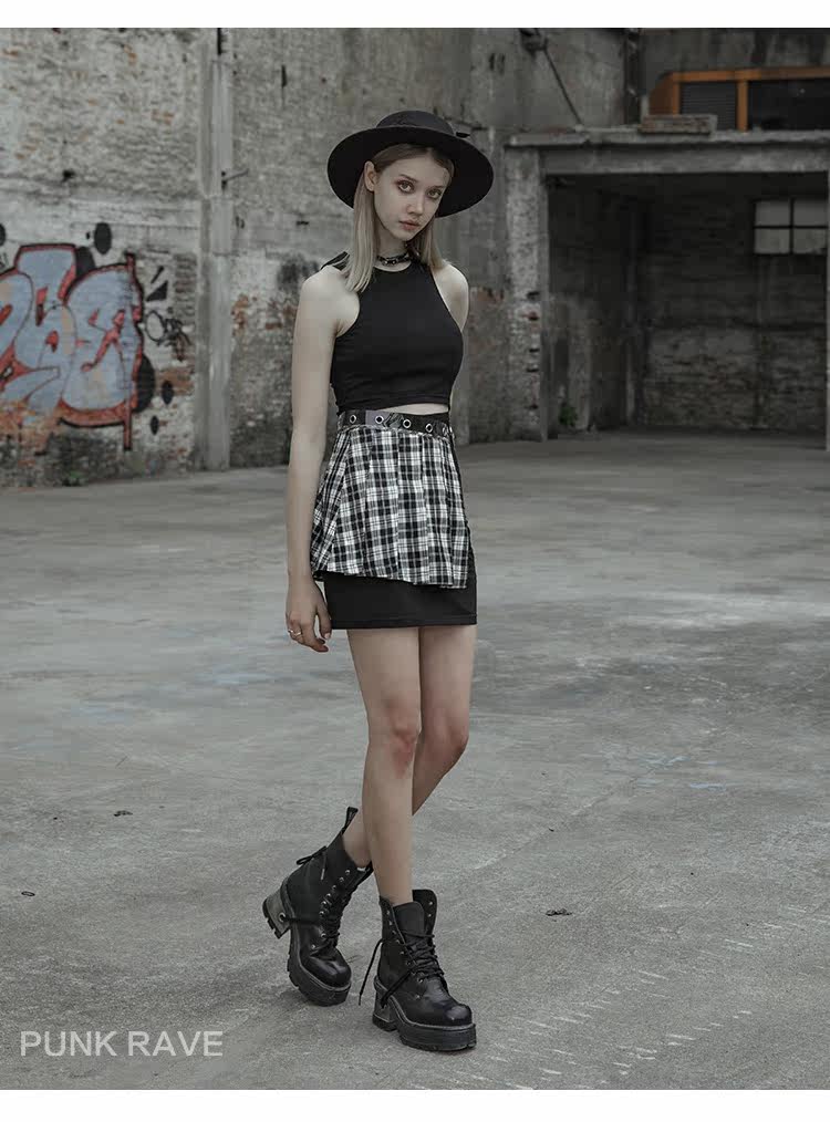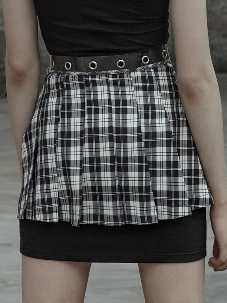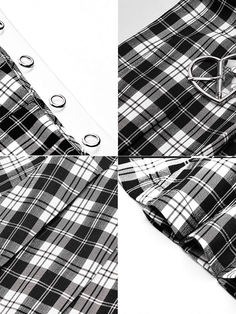 Punkrave Dark Cyber Style Плиссированная черно -белая клетчатая талия