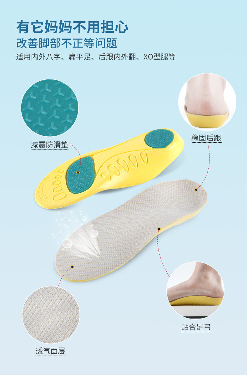 2 двойные детские коррекционные стельки плоские и восемь внутри и за пределами ноги, а внешние подушки с луком расположены с кривой o -типом x -обработкой.