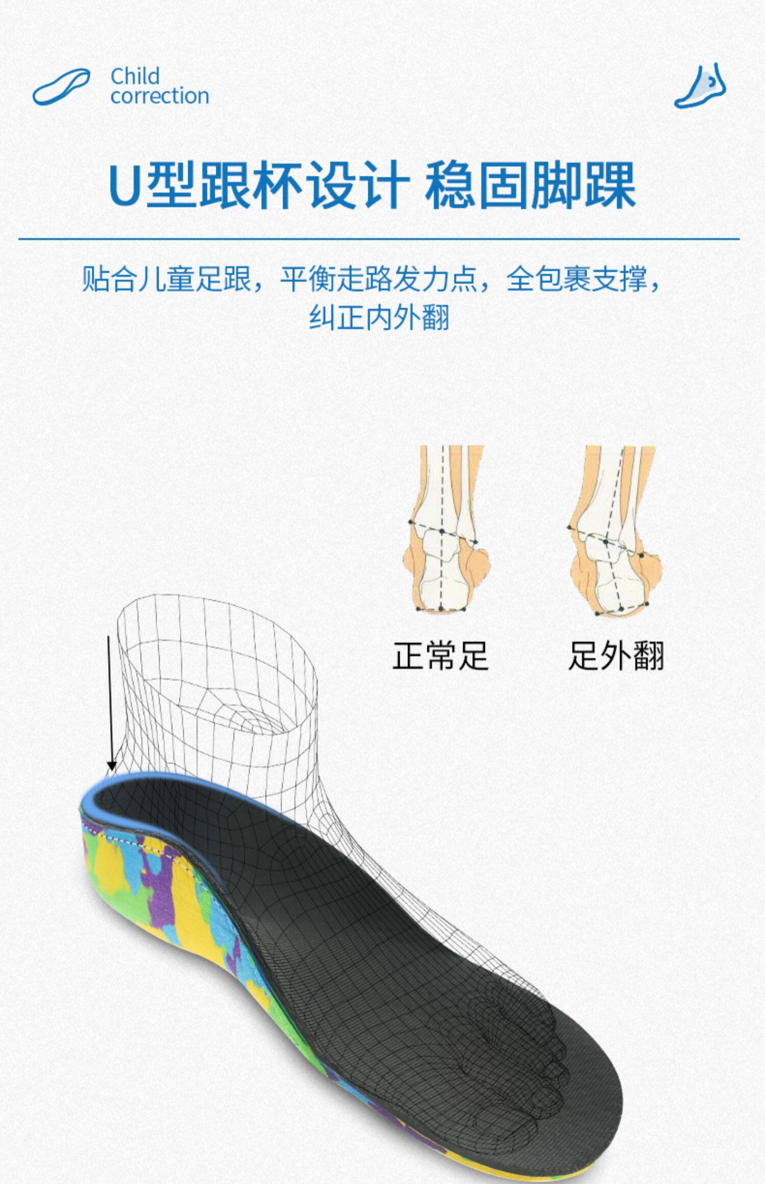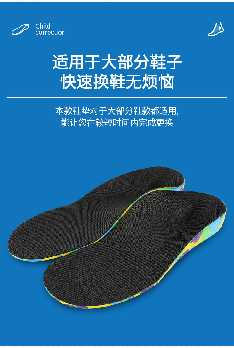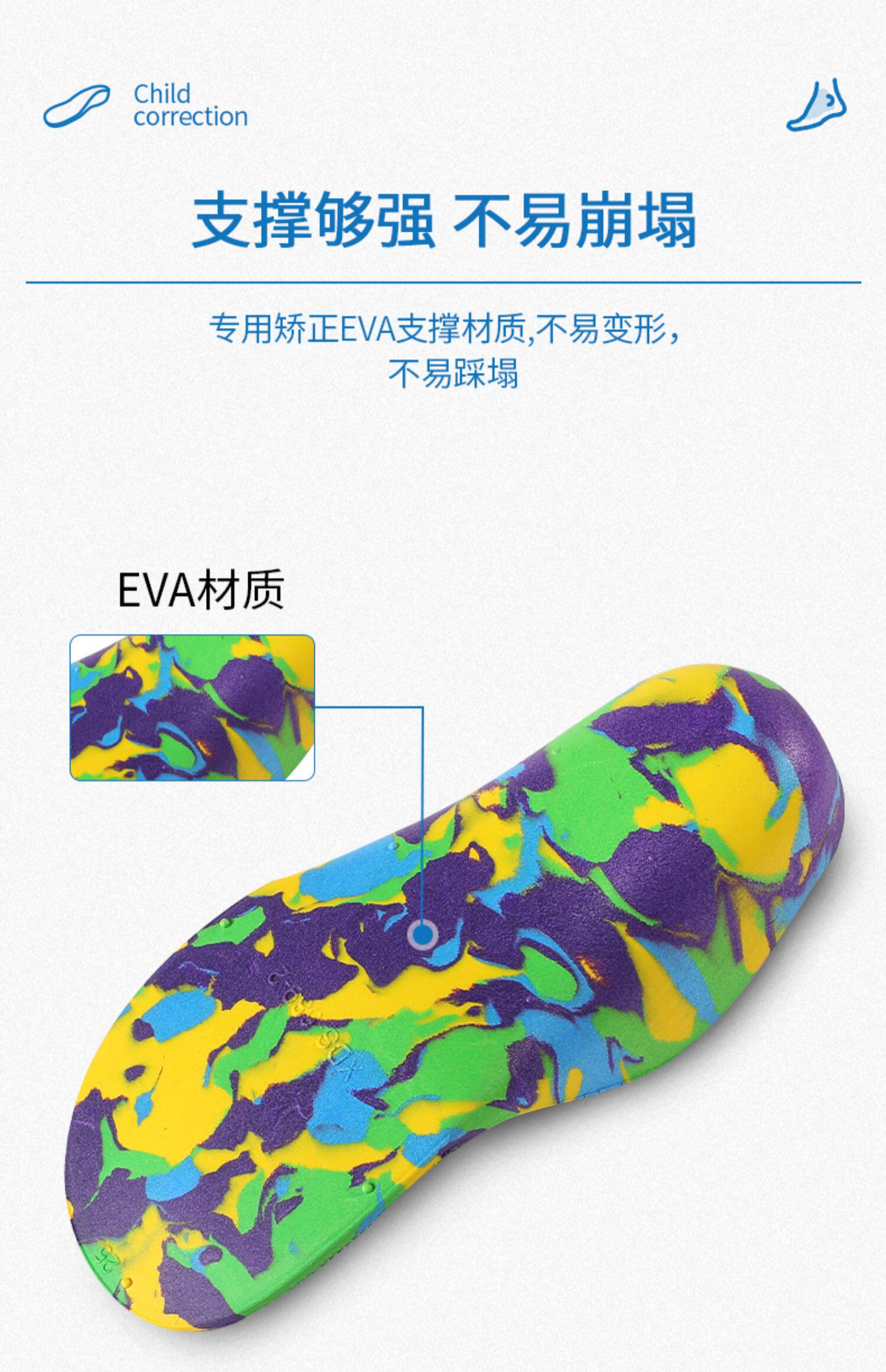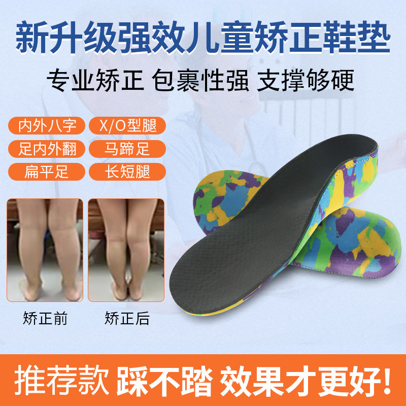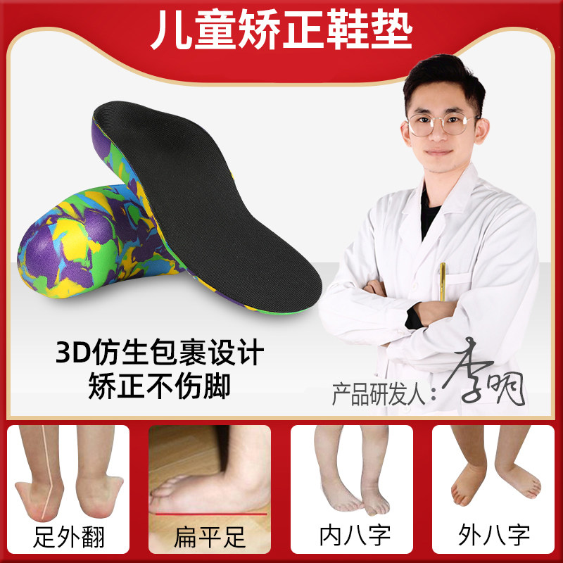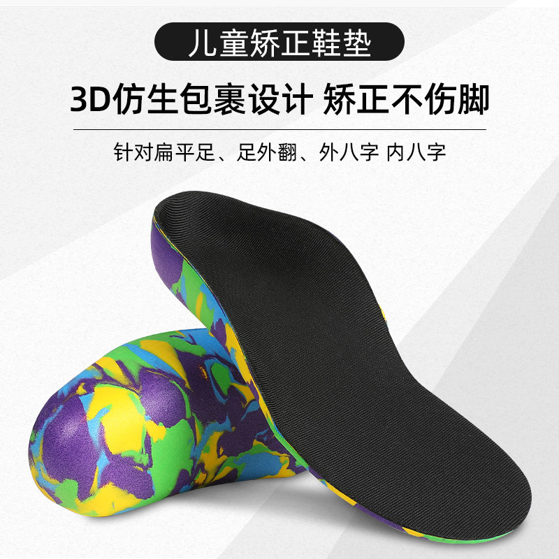Детские коррекционные стельки с плоскими ногами сплющены и охватывают, а внутренний и внешний восьми -символ -валик поддерживает арку.