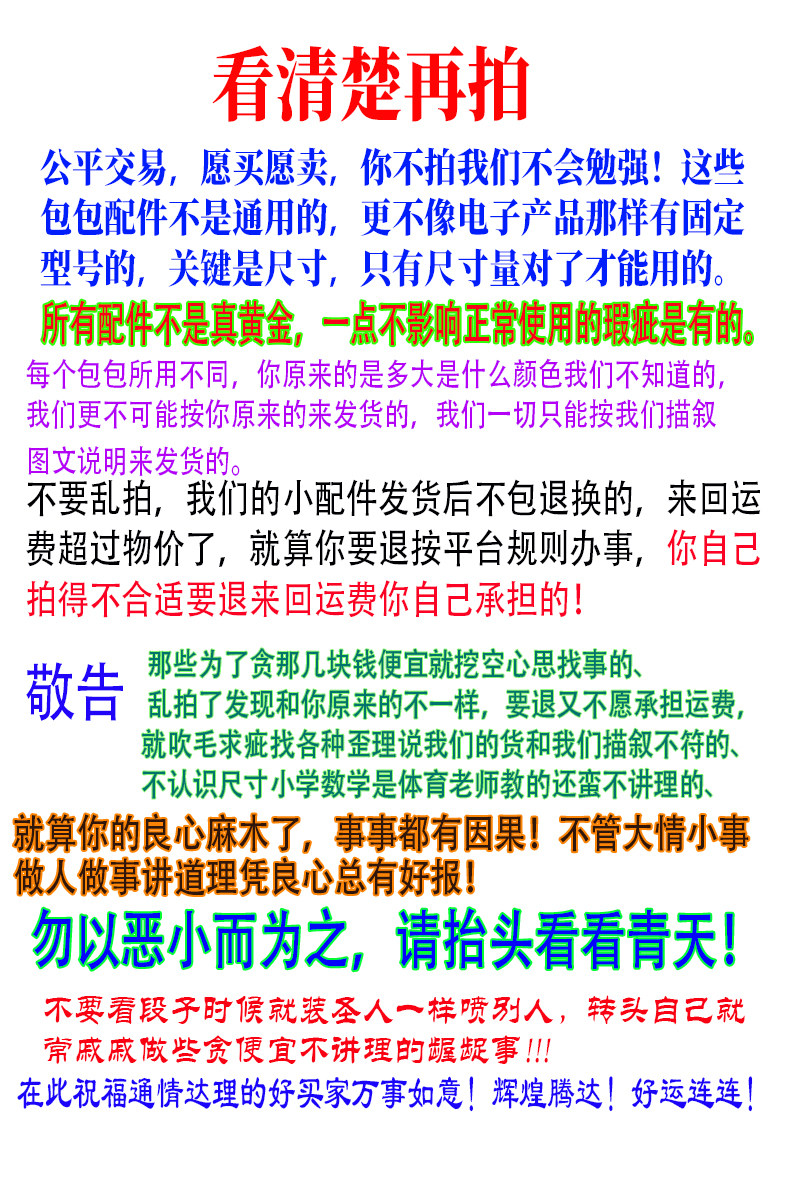 Смотрите описание размера повествования, объясните еще раз !! какие аксессуары вашей собственной сумки вам нужны, вы должны измерить его самостоятельно, мы не сказочная, мы не можем отправить в соответствии с аксессуарами, требуемыми вашей сумкой , мы можем Энн. Мы описали описание доставки! Мы строго проверим и сделаем снимки перед доставкой, поэтому аксессуары магазина не будут возвращены, как только они будут проданы !! Поскольку эта маленькая вещь уходит взад -вперед, плата за доставку превышает цену !!!