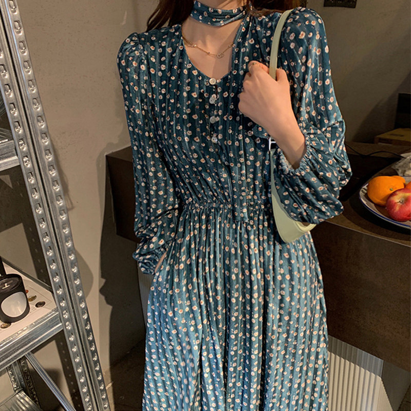 Весеннее дизайнерское синее приталенное платье, 2021 года, тренд сезона, в цветочек, в корейском стиле