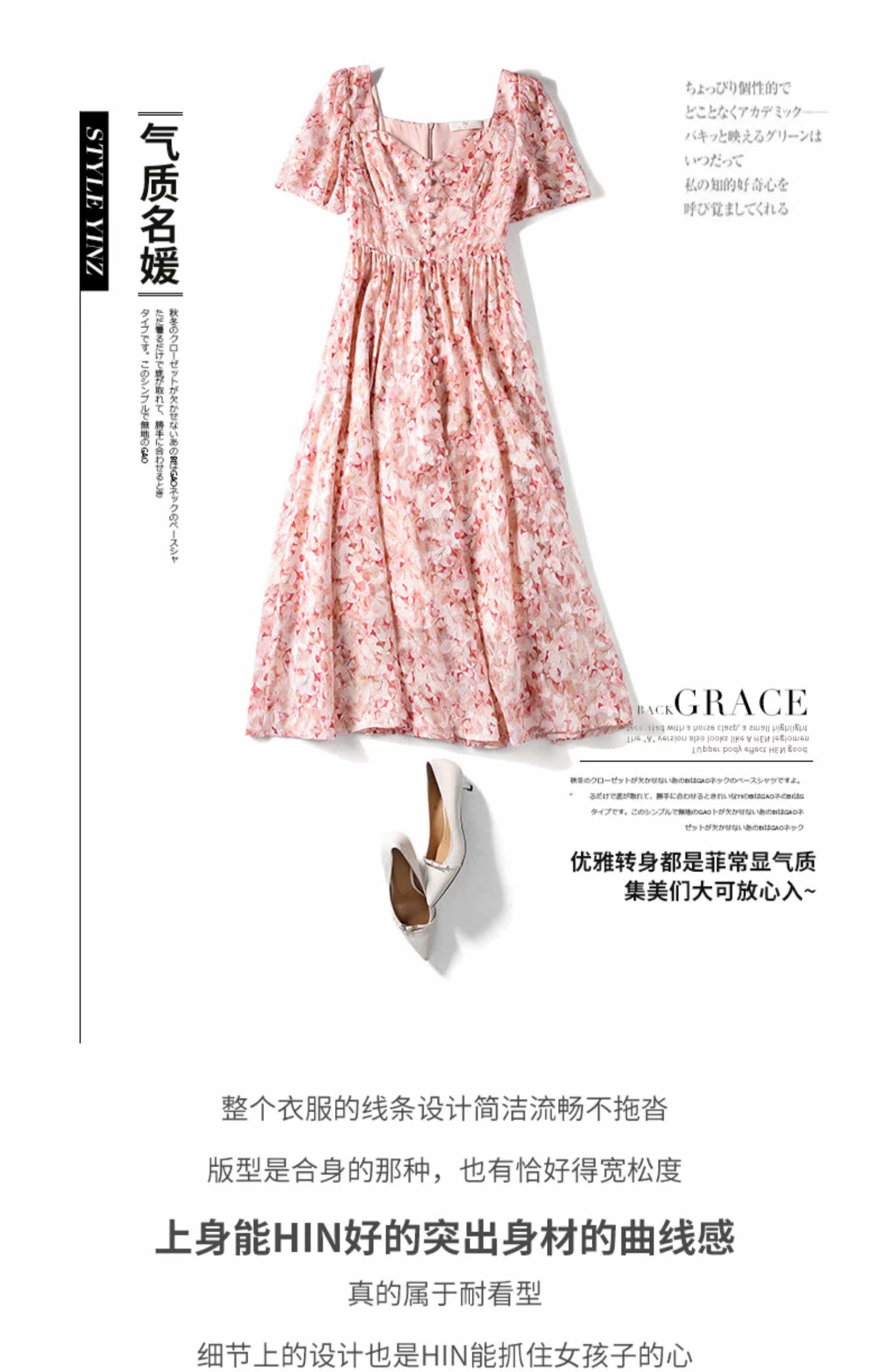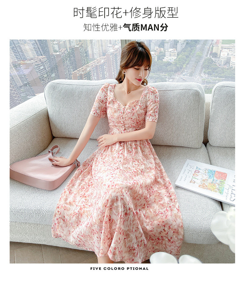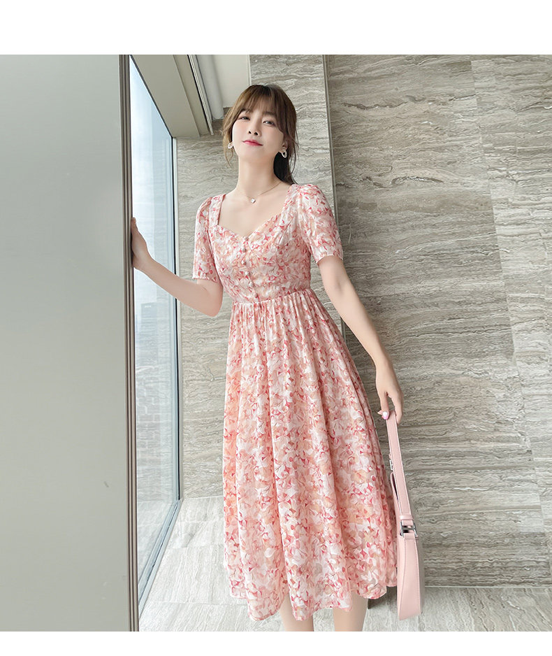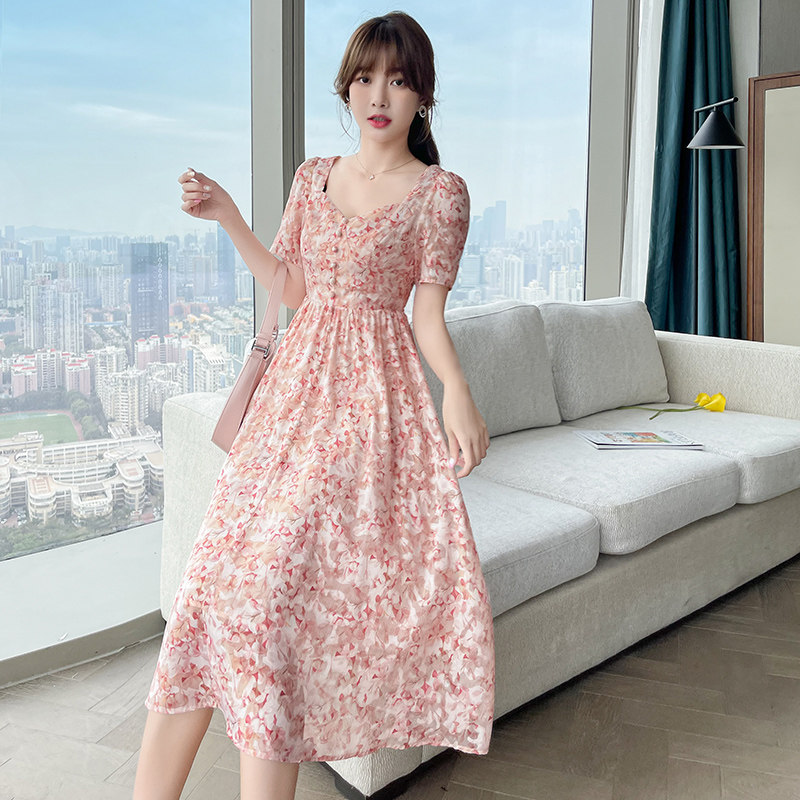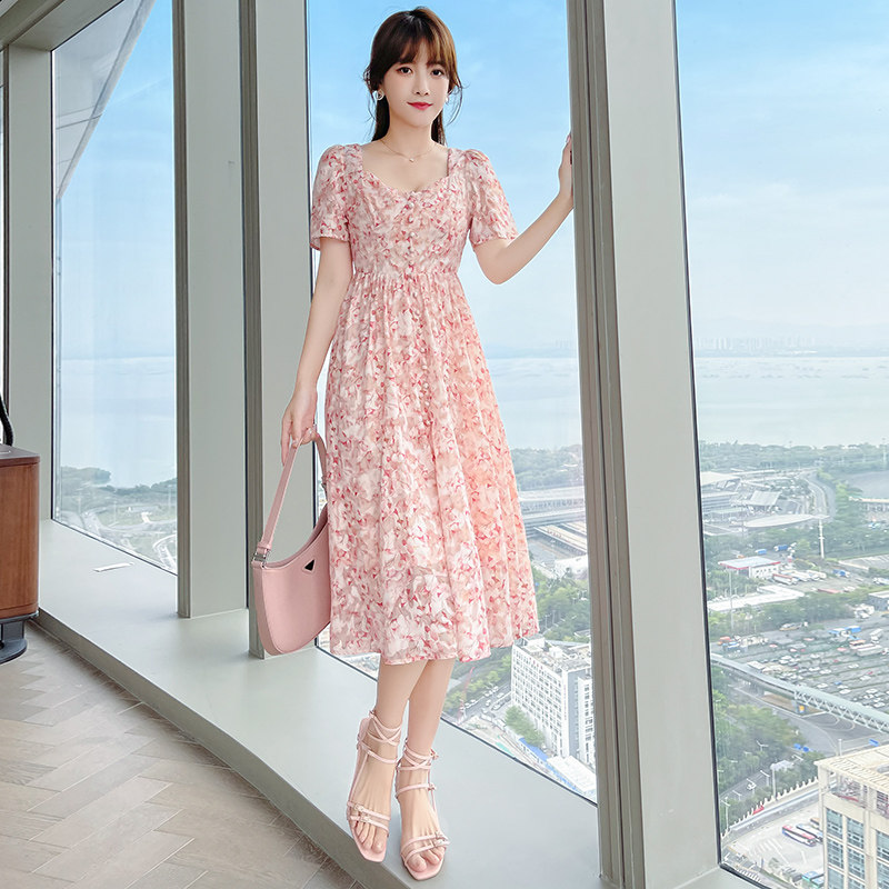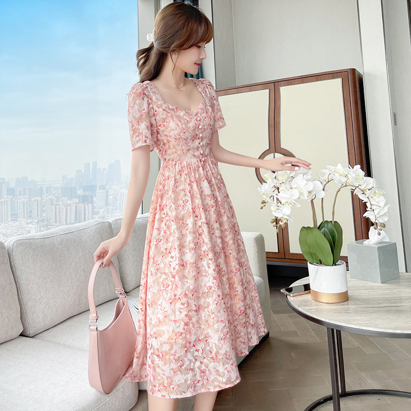 Шифоновая розовая летняя юбка, приталенное длинное платье, французский стиль, средней длины, в цветочек