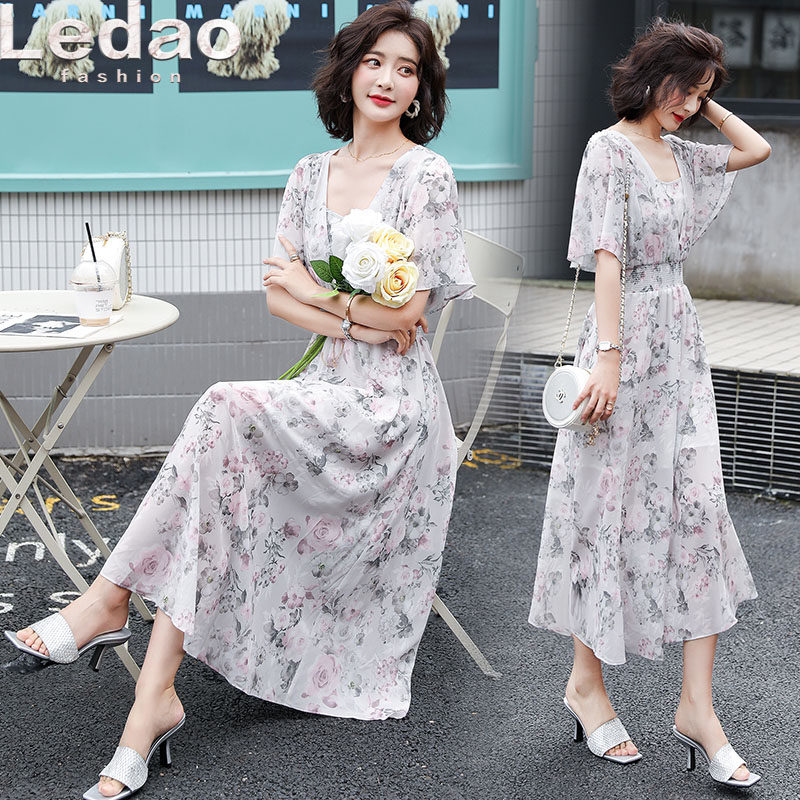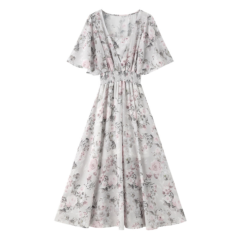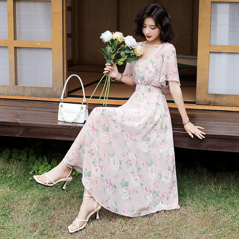 Шифоновое летнее элитное платье, в западном стиле, высокая талия, в цветочек