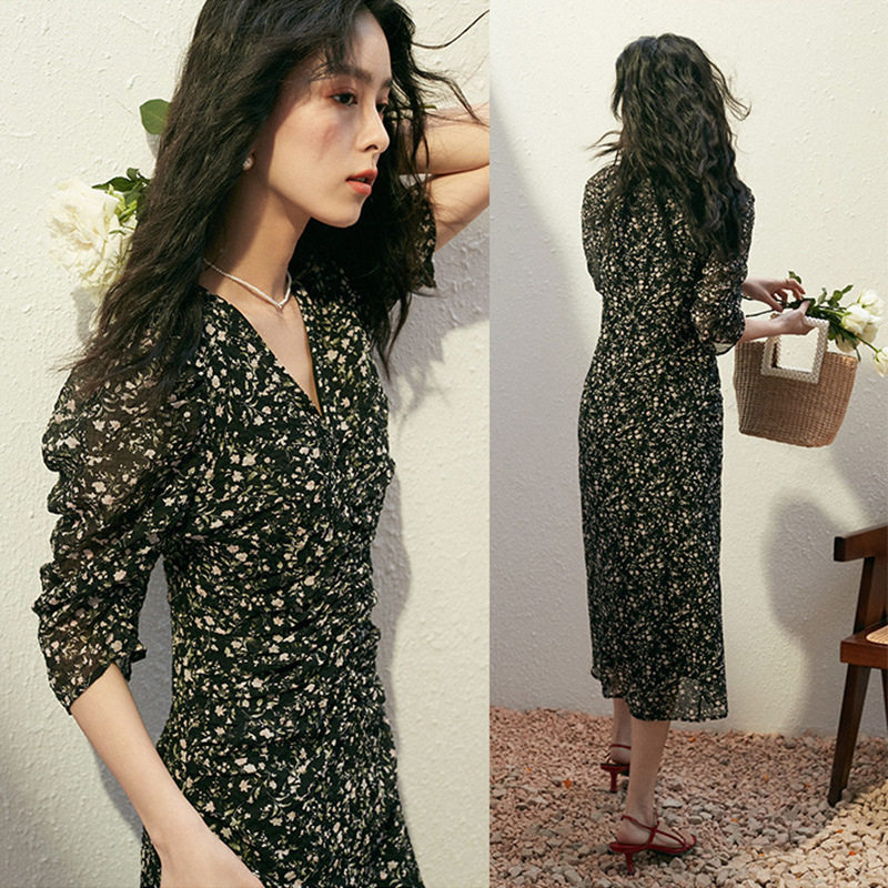 Летний ретро милый приталенный корсет, платье, сезон 2021, французский ретро стиль, V-образный вырез, рукава фонарики, с рукавом, в цветочек