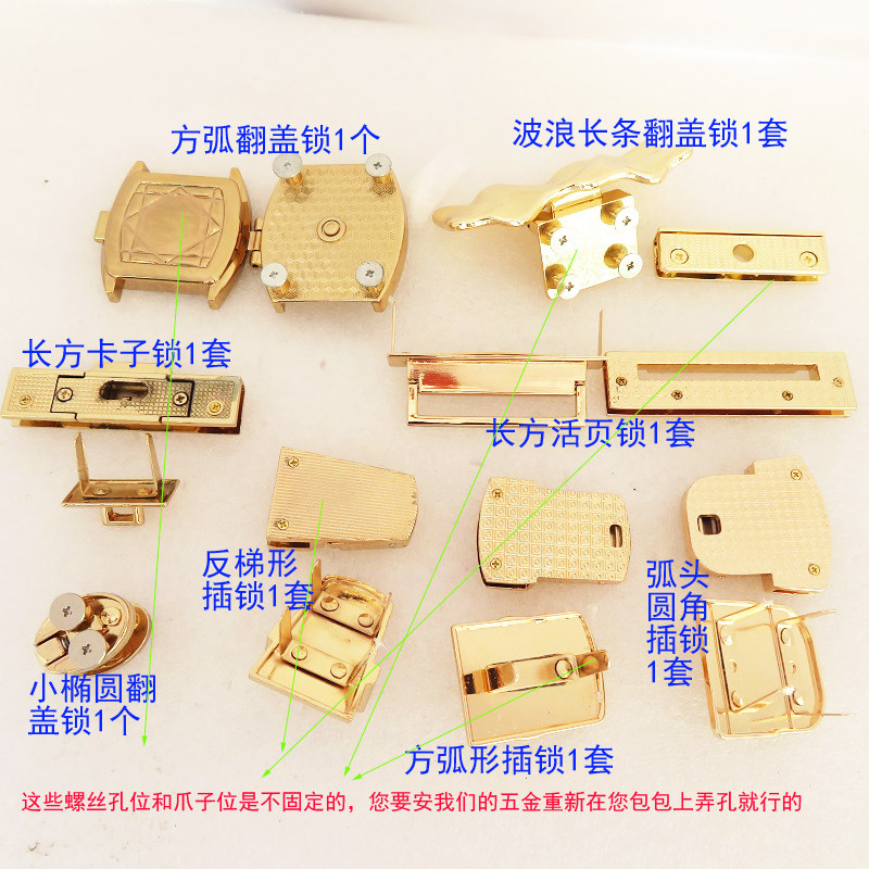 | Цвет: | 1 флип-замок с квадратной дугой, 1 комплект откидных замков с волнистыми полосками, 1 комплект прямоугольного замка с зажимом, 1 комплект прямоугольных створчатых замков, 1 небольшой овальный замок, 1 комплект обратного трапециевидного врезного замка, 1 комплект врезных замков с квадратной дугой, 1 комплект врезных замков с закругленными углами и дуговой головкой |