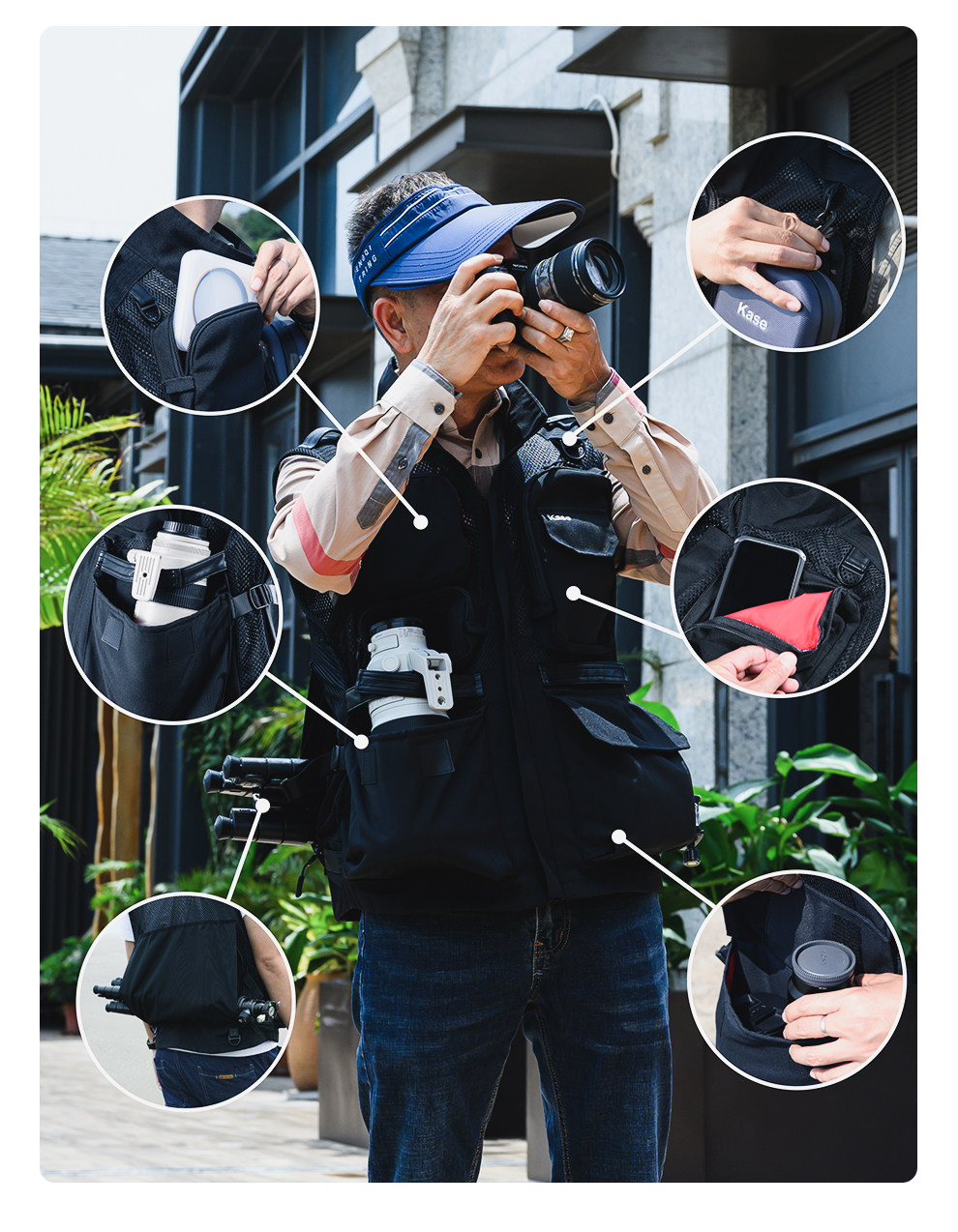 Флагманский магазин kase. Жилет для фотосъемки. Многофункциональный дизайн с множеством карманов, отвечающий потребностям хранения в путешествии. Водонепроницаемый, дышащий, впитывающий пот, износостойкий и грязеотталкивающий фильтр-мешок для жилета фотографа.