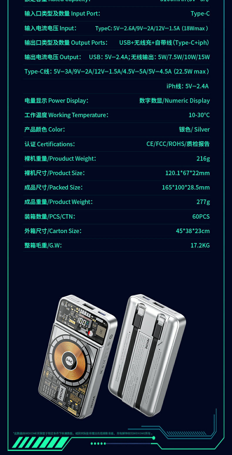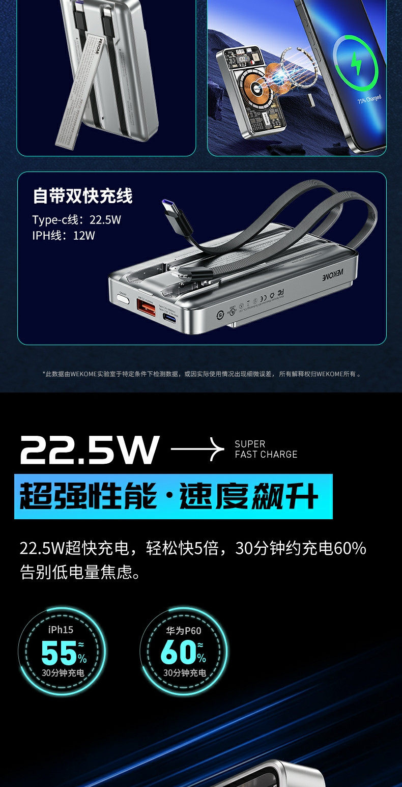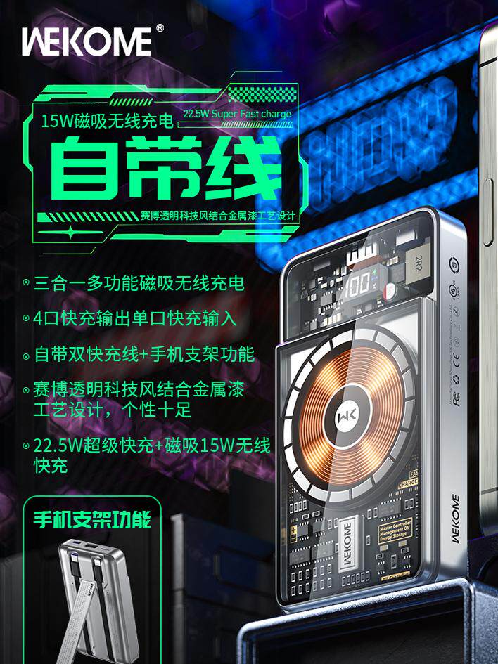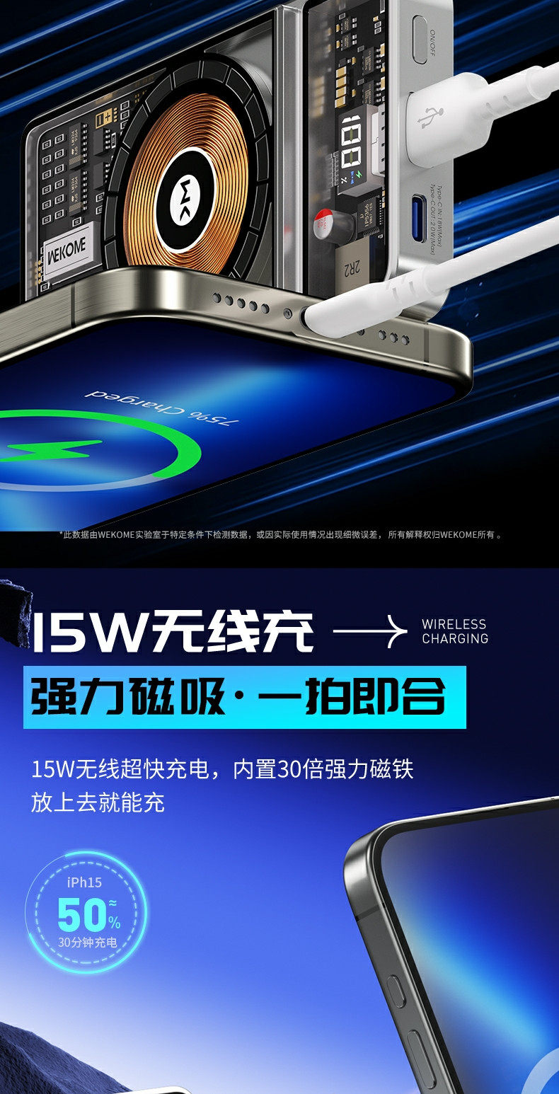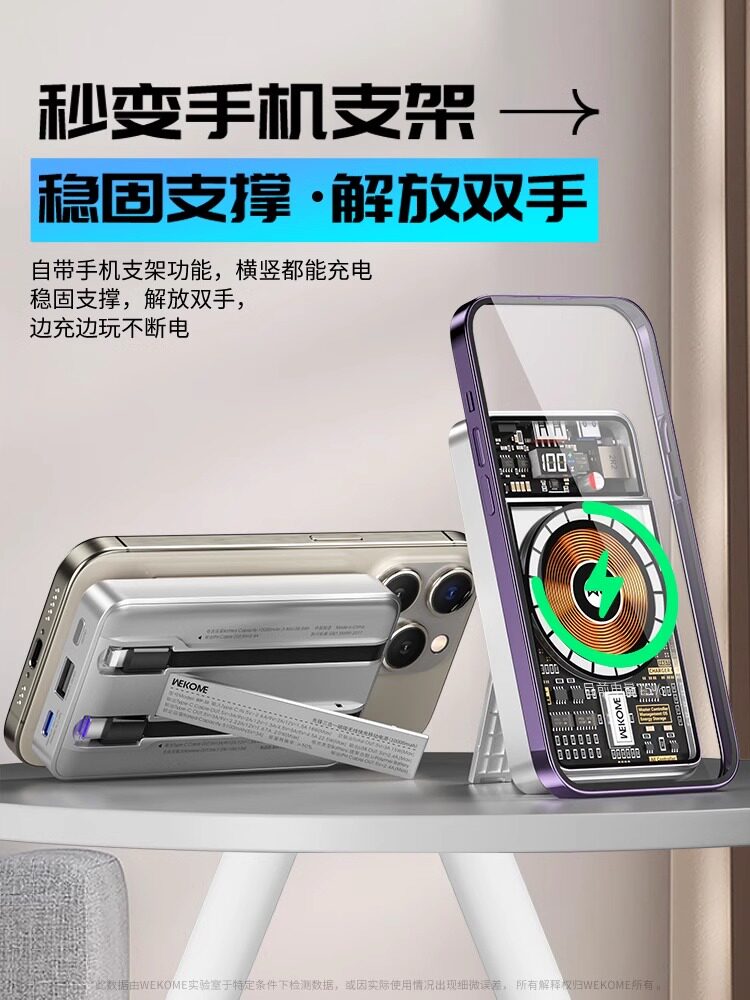 Wekome Transparent Magnetic Power Bank 10000 MAH 22,5 Вт Super Fast Flash Flash Зарядка Компактная портативная большая емкость, подходящая для Apple 15 Promax Huawei Honor, поставляется с двойным мобильным источником питания