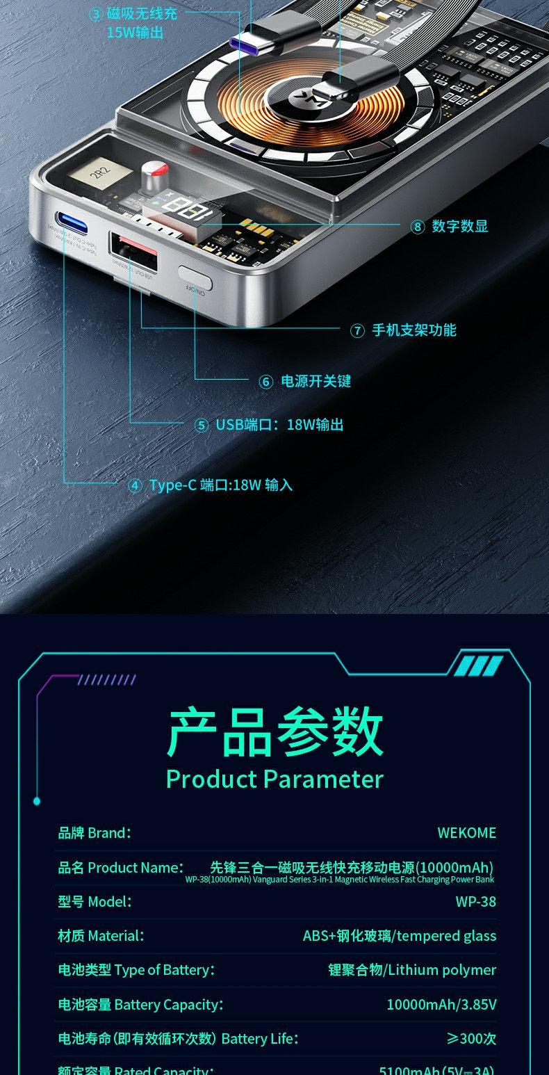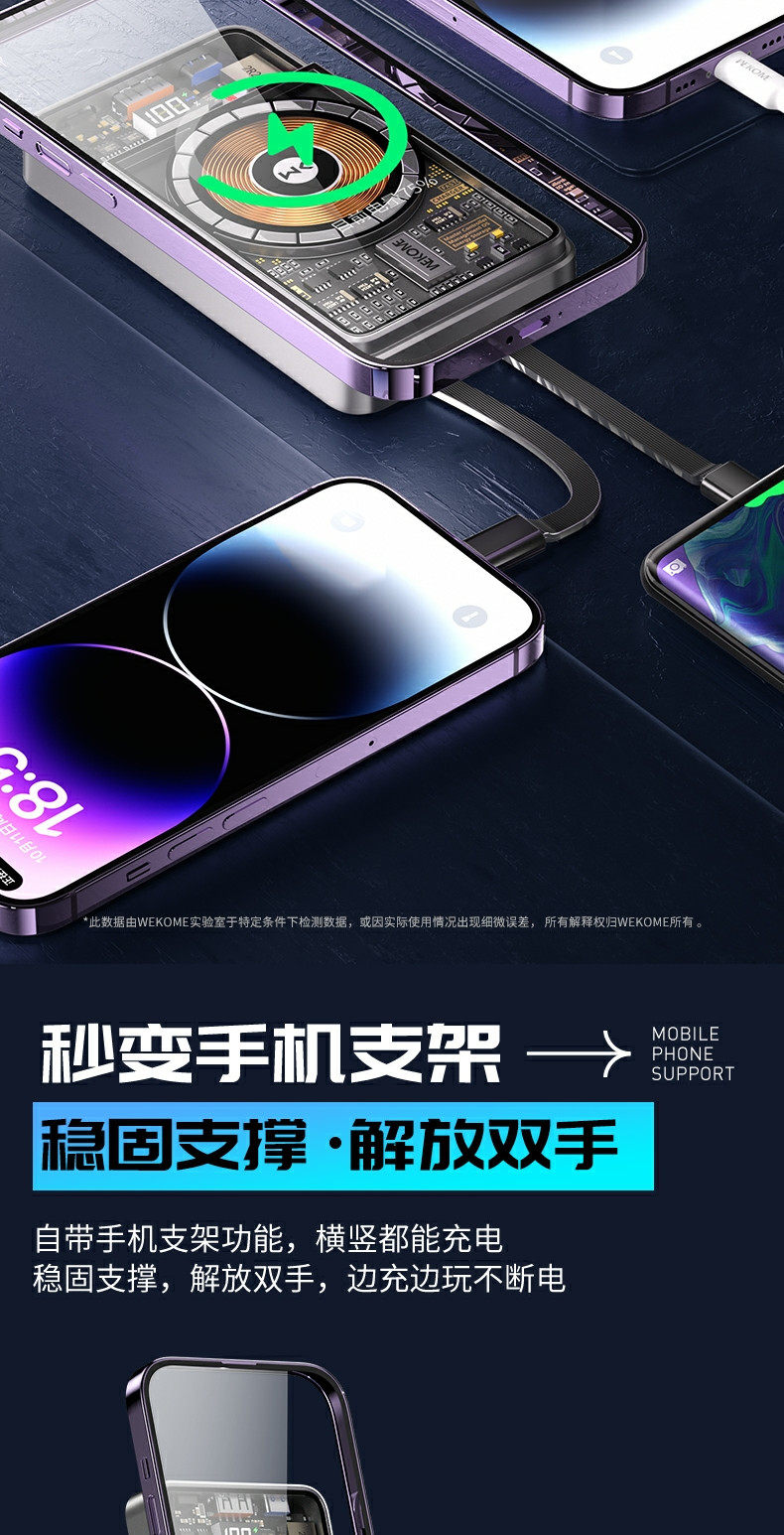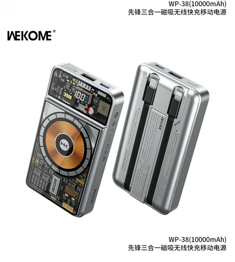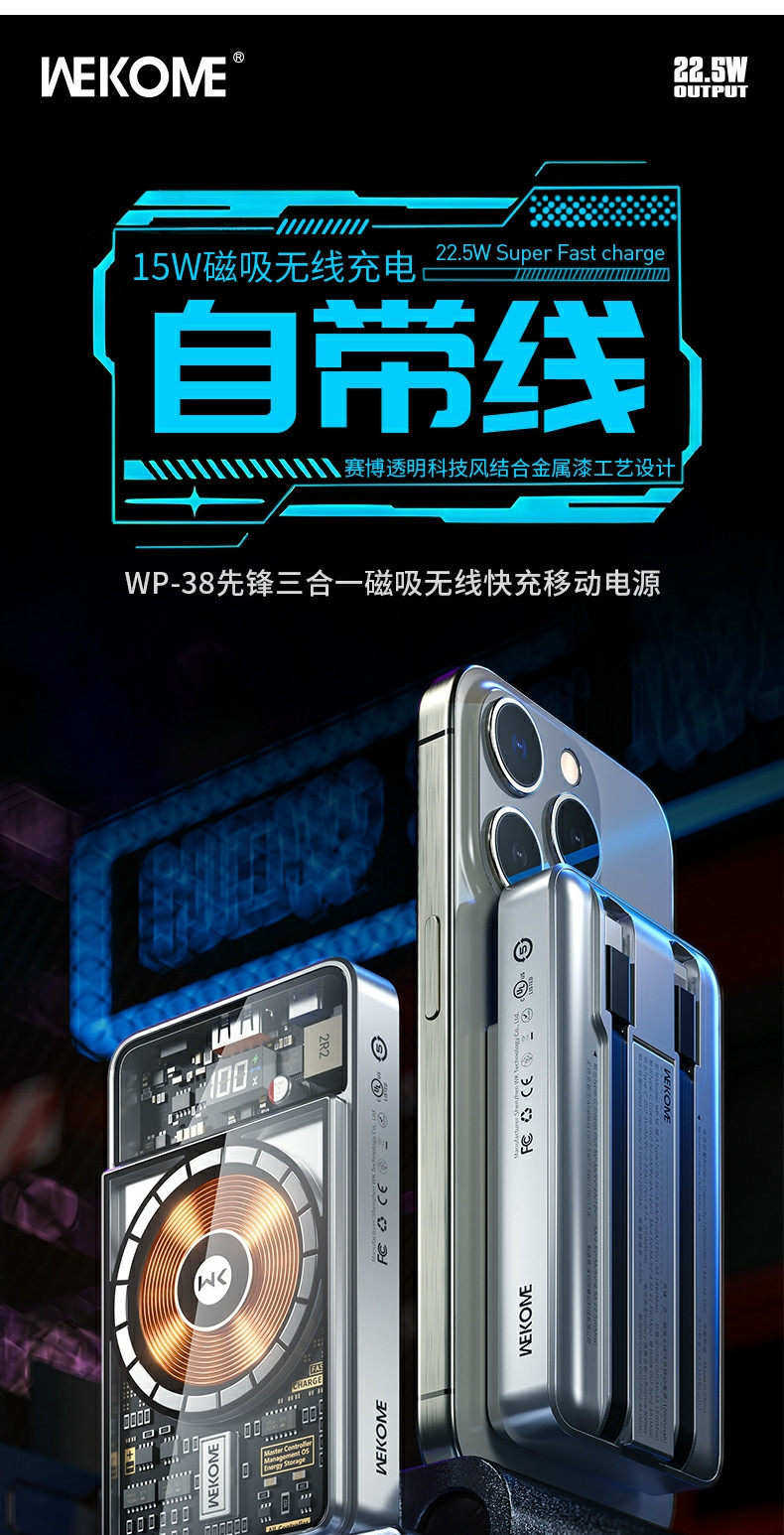 Wekome Transparent Magnetic Power Bank 10000 MAH 22,5 Вт Super Fast Flash Flash Зарядка Компактная портативная большая емкость, подходящая для Apple 15 Promax Huawei Honor, поставляется с двойным мобильным источником питания