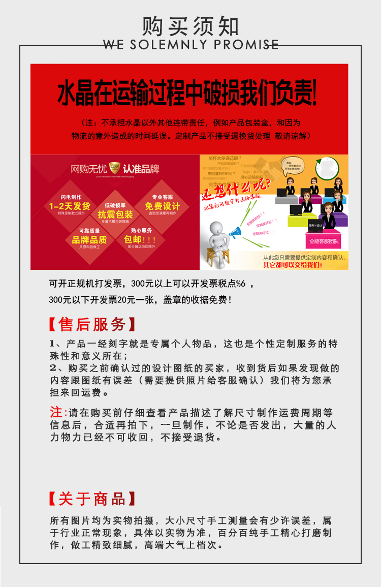 2 Предоставьте контент, который вы хотите сделать с помощью различных методов, таких как Wangwang или Mailbox. Если вы выгравировали логотип, вам необходимо предоставить формат CDRAI, EPS, если вы предоставите файл гравировки производства самостоятельно. Для обслуживания клиентов.[Пожалуйста, обратите внимание на то, есть ли неправильные слова, пропущенные слова, пунктуация и дата и т. Д.