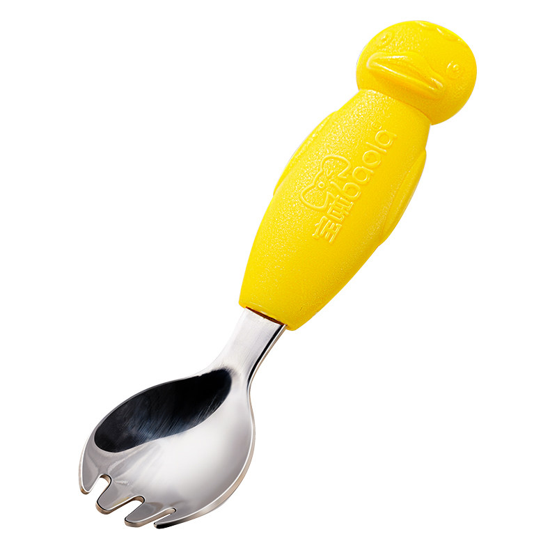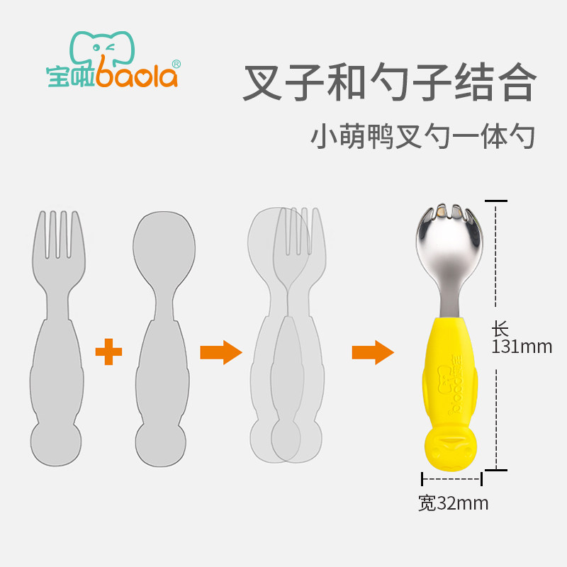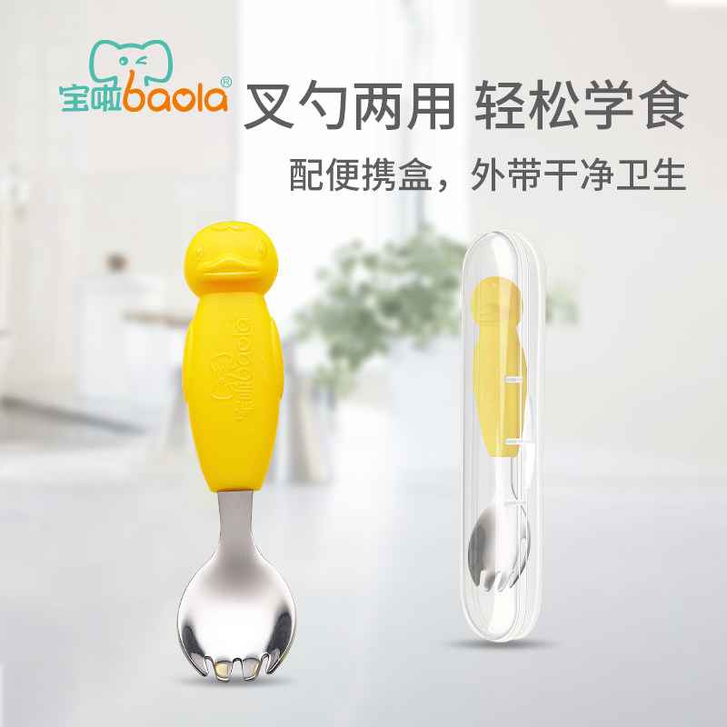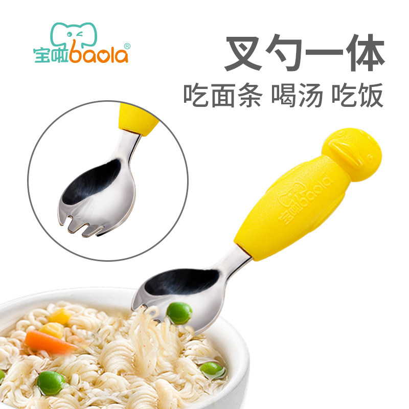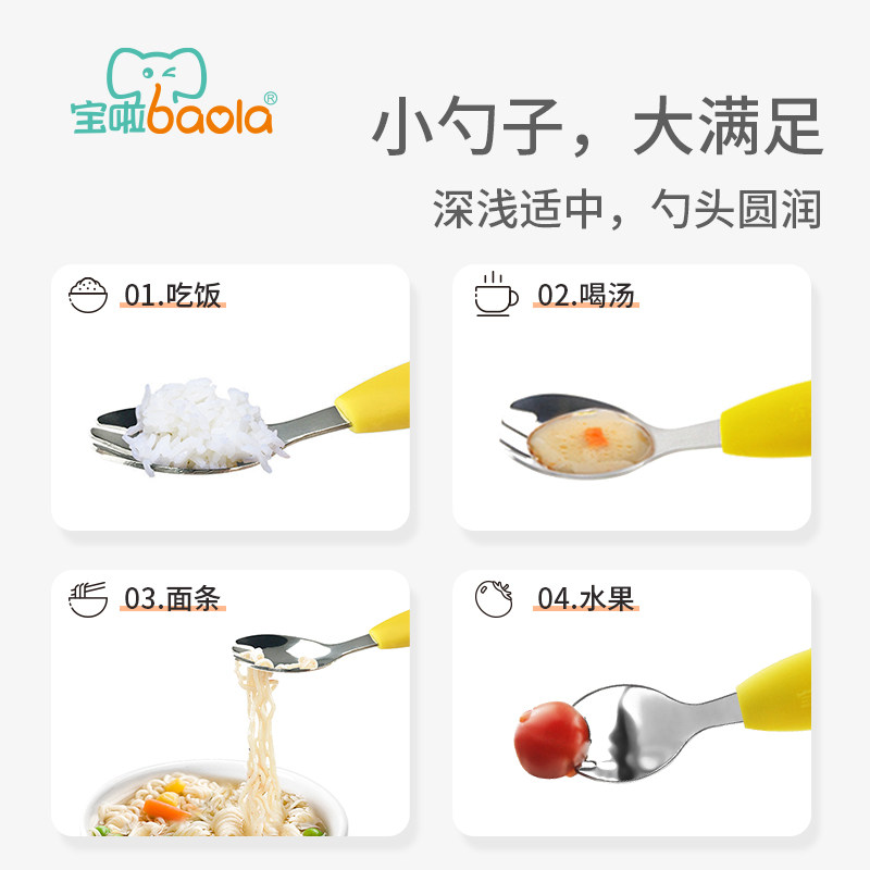 宝啦 Младенцы учатся есть ложки из нержавеющей стали, которые есть, есть ложки вилки, интегрированные младенцы и маленькие дети тренируют рисовые ложки