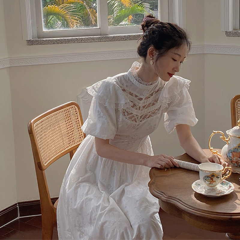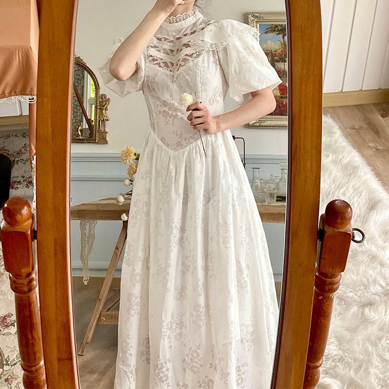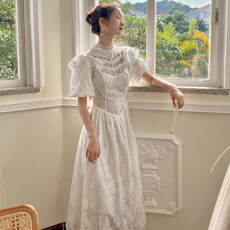 Ретро кружевное летнее платье, приталенный корсет, длинная юбка, французский стиль, рукава фонарики