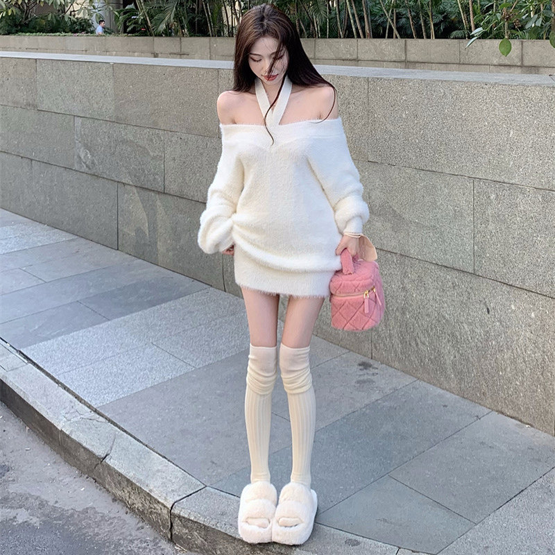 Дизайнерский модный трикотажный свитер, демисезонное платье, открытые плечи, тренд сезона, подходит для подростков, изысканный стиль