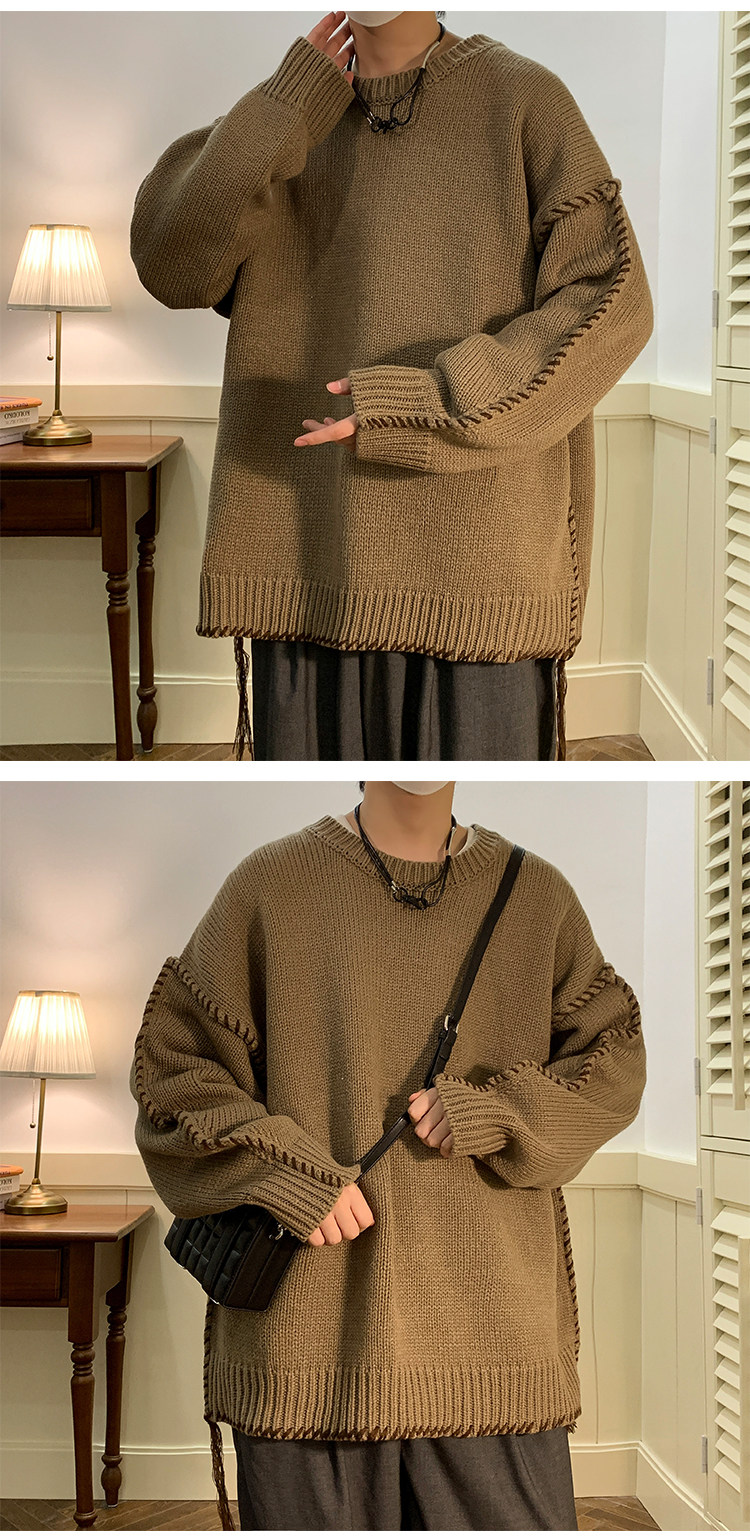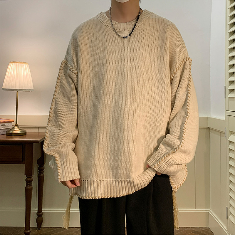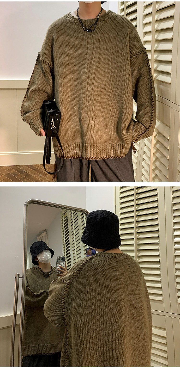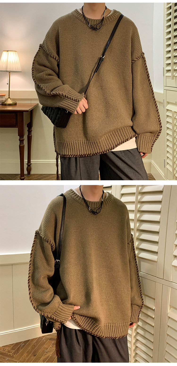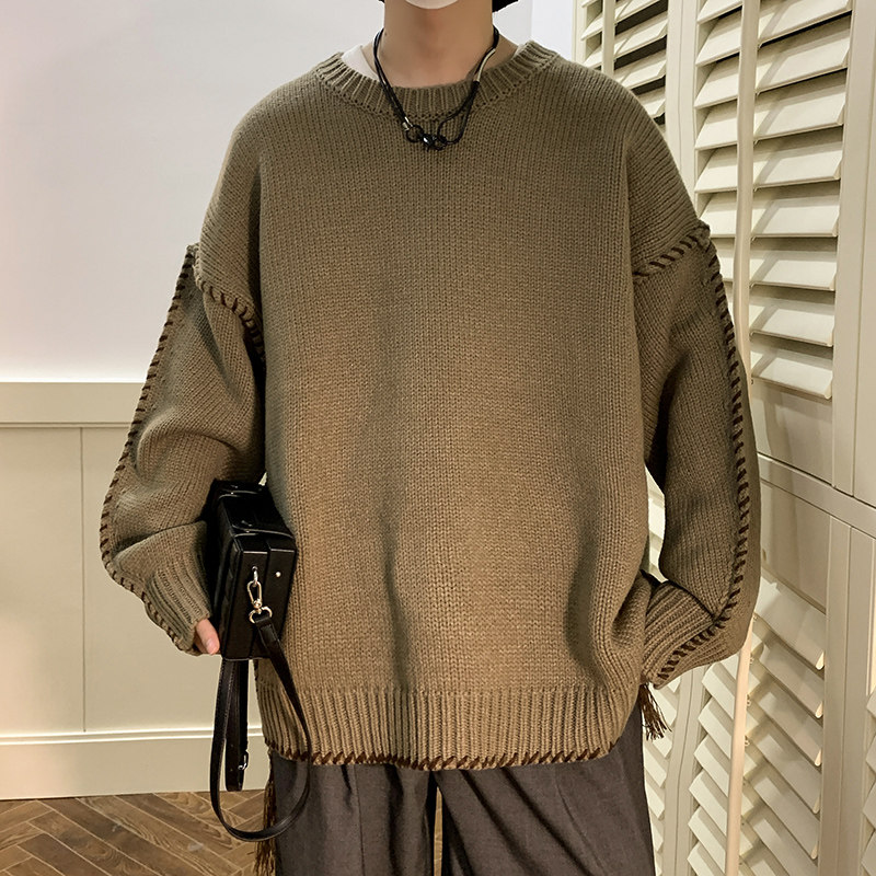 Ретро демисезонный дизайнерский трикотажный шерстяной свитер с круглым воротником, в американском стиле, тренд сезона, увеличенная толщина, свободный крой