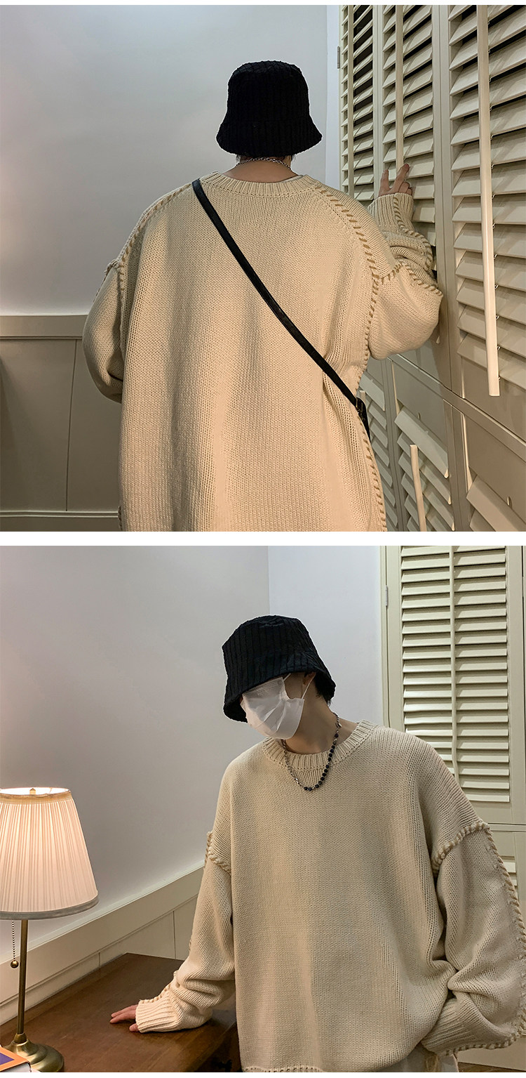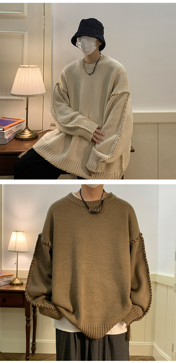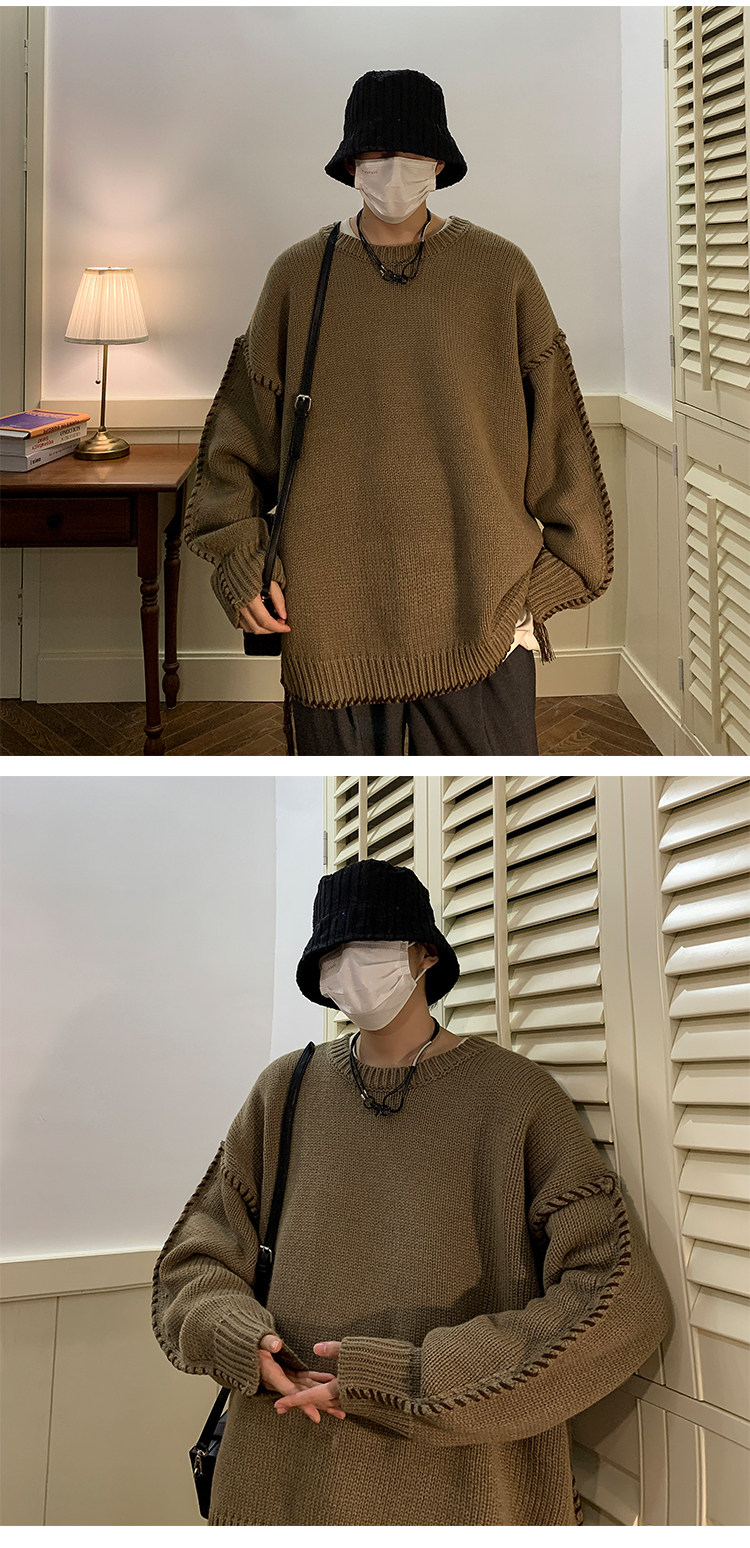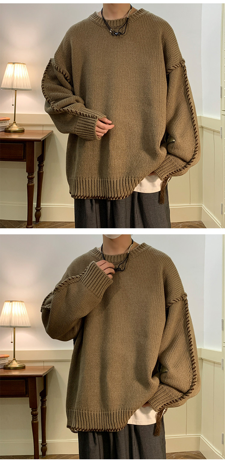 Ретро демисезонный дизайнерский трикотажный шерстяной свитер с круглым воротником, в американском стиле, тренд сезона, увеличенная толщина, свободный крой