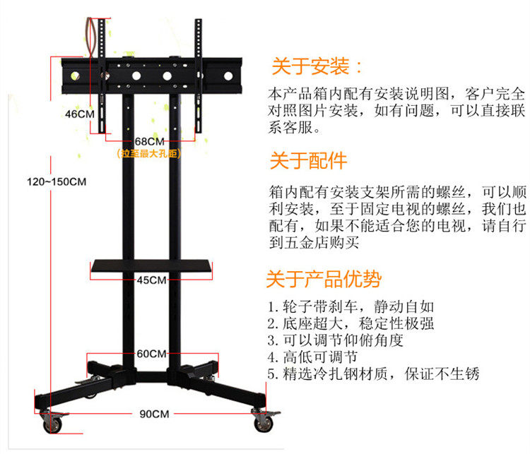 42505560655-дюймовый ЖК-телевизионный телевизионный пол, поднятая телевизионная вешалка с колесами, вертикальная стойка дисплея