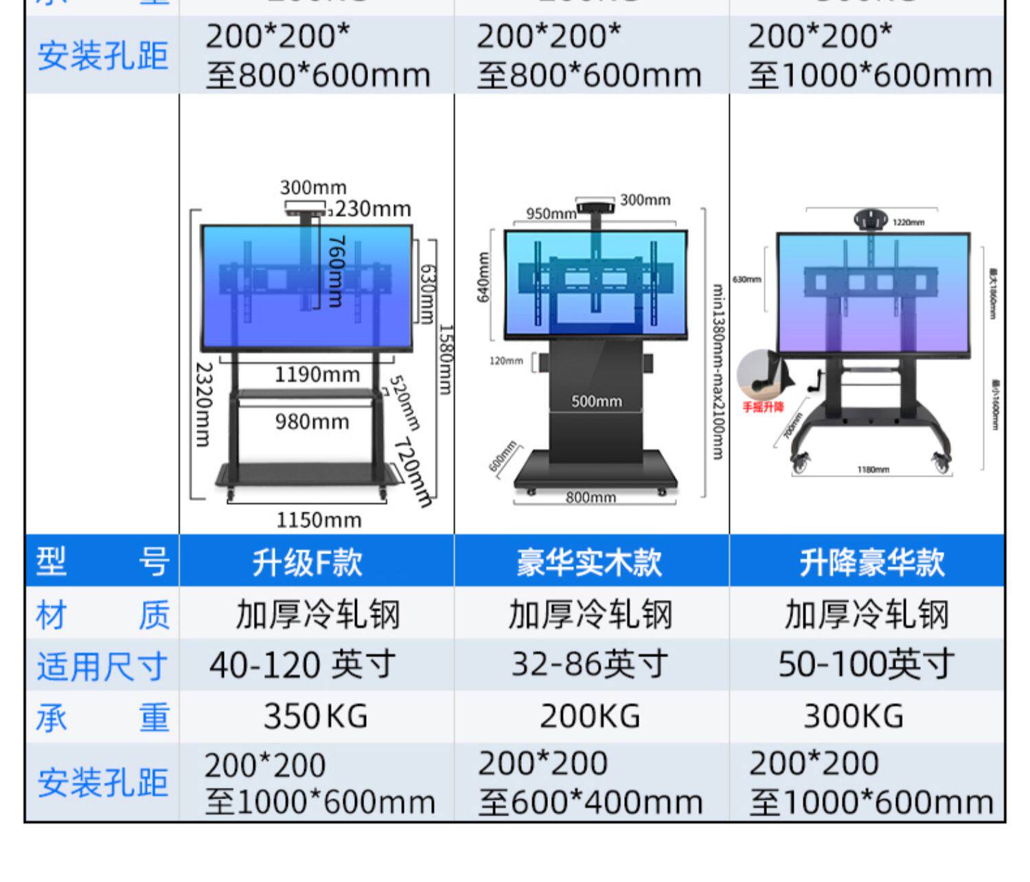 Цвет: 【Практическое издание】 32-75-дюймовое интегрированное основание сгущенное и утолщенное, несущее нагрузку около 130 кг, 【Deluxe Edition】 32-75 дюймов плюс поддоны, нагрузка примерно 150 кг, 【Стандартное издание】 55-95-дюймовый простая конструкция не занимает ни одной земли, носит около 155 кг, 【Integrated Standard Deluxe Edition】 40-95 дюймов с перетаскиванием диска, нагрузки около 200 кг, 【Ultravel Edition】 55-100 дюймов Супер экономическая эффективность, несущая нагрузка около 220 кг, 【Усовершенствованная версия】 52-100 дюймов плюс поддона., 【Enhanced Edition】 55-110-дюймовый большой экран Специальное супер-нагрузочное несущее около 300 кг, 【Supreme Edition】 55-120 дюймов для женщин плюс поднос, несущая нагрузка около 330 кг, 【Сплошная деревянная пластина】 32-70 дюймов Столечная деревянная колонна плюс перетаскивание нагрузки на груз 120 кг, 【Сплошная деревянная тарелка】 40-86 дюйма с твердым деревянным столбцом плюс перетаскивание нагрузки на нагрузку 150 кг, 【Сплошная деревянная тарелка】 55-120 дюймов с твердым деревянным столбцом плюс перетаскивание нагрузки на груз 200 кг, 【Версия для ручной работы】 40-110 дюймов Ручной подъемник и подтягивание 200 кг