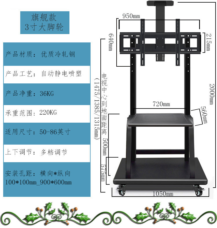 Универсальный ЖК -телевизионный кронштейн может переместить пола -на тележок, детское сад Honghewo 65/75/85 дюйм