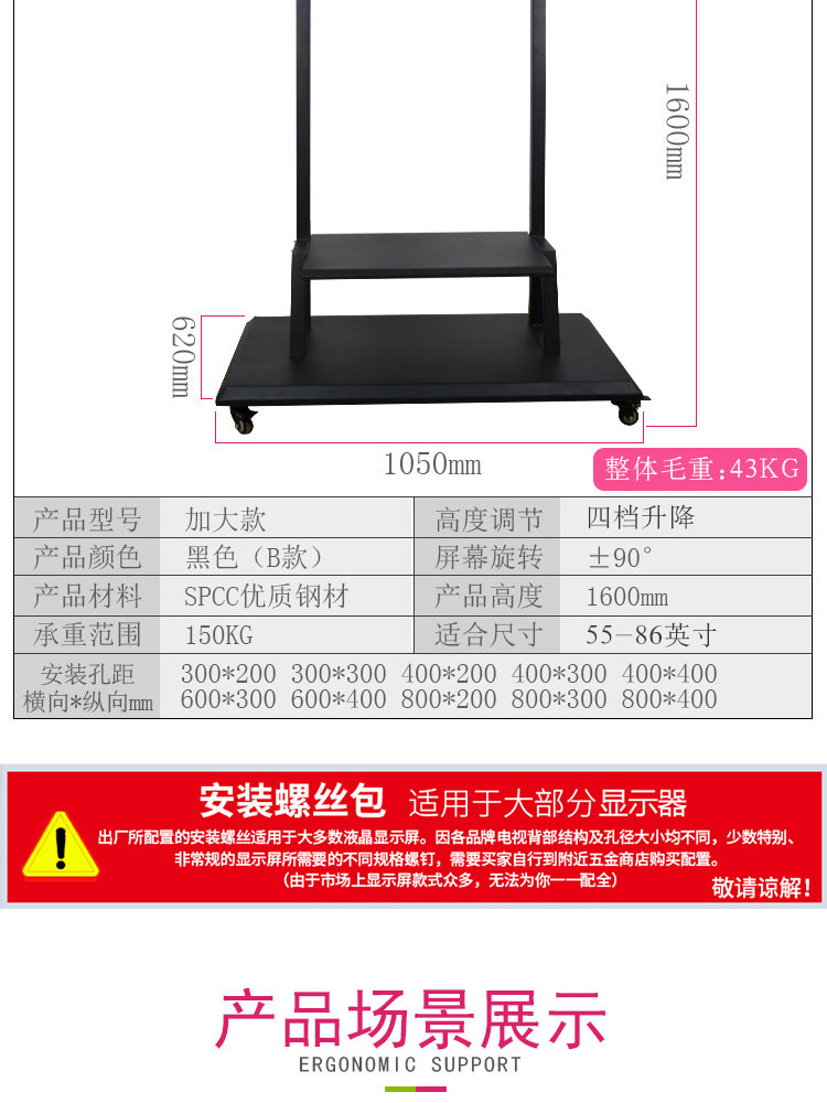 | Цвет: | [Фиксированная головка] 32-75-дюймовый/сталь и древесина Смешанный четыре раунда, 700x430x (1350-1550) мм, [Фиксированная головка] 55-86-дюймовый/сталь и древесина Смешанный четыре раунда, 900x500x (1350-1550) мм, [Фиксированная головка] 55-120 дюймов/сталь и деревянная смешанная четырехколесная стойка 1050x570x (1450-1650) мм, [Вращающаяся головка] 32-75 дюймов/горизонтальный вертикальный экран. Вращение 90 градусов, 800x600x (1230-1510) мм, [Вращающаяся головка] 55-86 дюймов/горизонтальный вертикальный экран. Вращение 90 градусов, 1050x620x (1230-1510) мм |