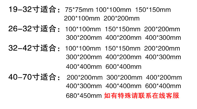 | Цвет: | Утолщенное универсальное основание 14-35 дюймов, Дисплей складной базы 14-24, Большое универсальное основание 37-65 дюймов, Утолщение Общее основание 26-32 (расстояние отверстия 40*30), Утолщенное общее основание 32-42 (расстояние отверстия 60*40), Универсальное основание с двойным колонном 40-70 (расстояние отверстия 68*45), Утолщенное общее основание 32-55 (расстояние отверстия 40*40) |