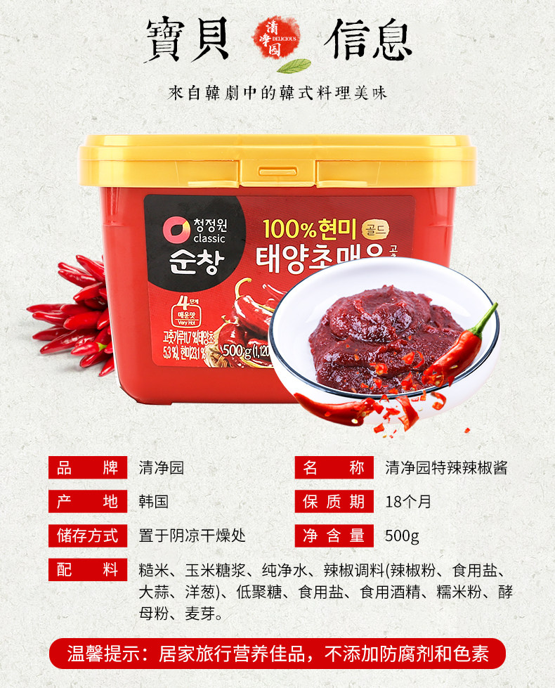 清净园 Специальный пряный соус чили 500G Корейский импортный соус из чили камный камный горшок соус бибимбап Chunchang Специальный горячий соус чили