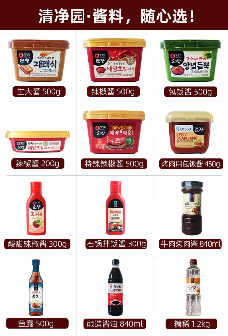 | Вкус: | Суп с большим соусом (500 граммов желтой коробки), Каменной горшок бибимбап соус (500 граммов соуса чили красной коробки), Комбинация большого соуса перца (по 500 грамм каждая) |