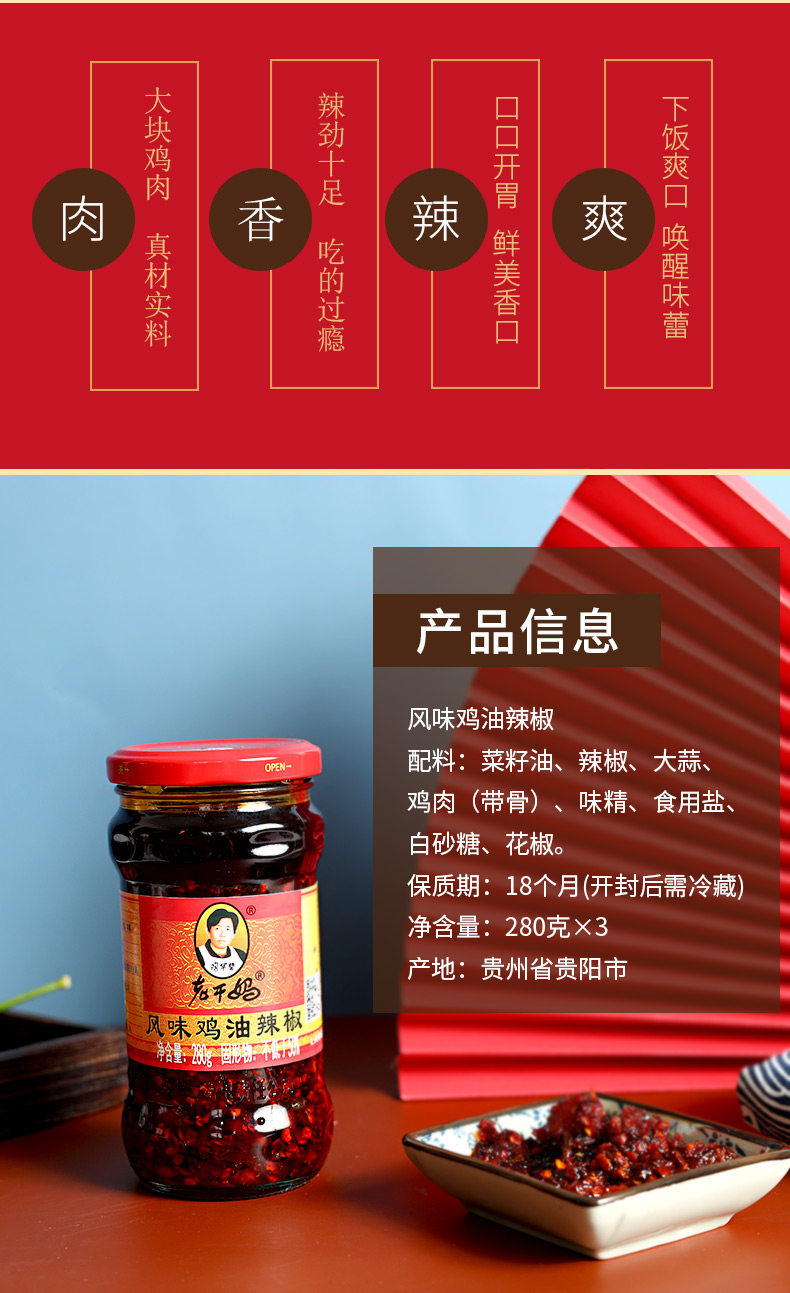 Laoganma Flavy Chicken Moil Pepper 280G*3 Бутылки с фирменным соусом Гуйчжоу для приготовления лапши и рисовой курицы