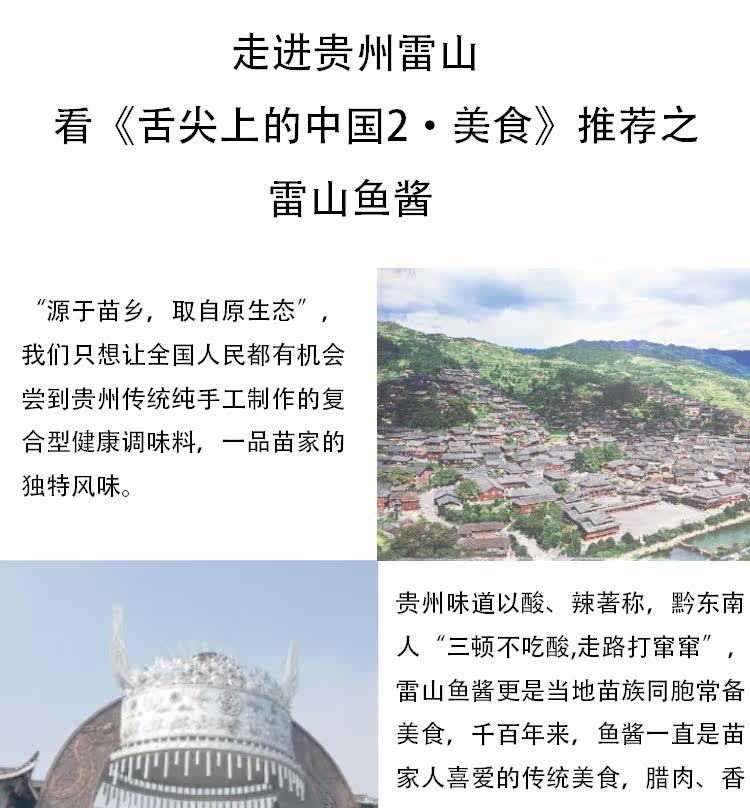 Лейшан рыбный соус в "Китай 2 на кончике языка 2«Лотерея в лотерею заставила многих людей знать этот восхитительный особый соус, и популярность значительно возросла.Лейшан, расположенный вЮго -восточная префектура Guizhou Miao и DaiЮго -запад.В 184 километрах от правительства провинции и префектурыКайли42 километра.Лейшан округЭтнический стиль, основанный на МИАО, сильный, простой и элегантный и полон далеких культурных коннотаций.