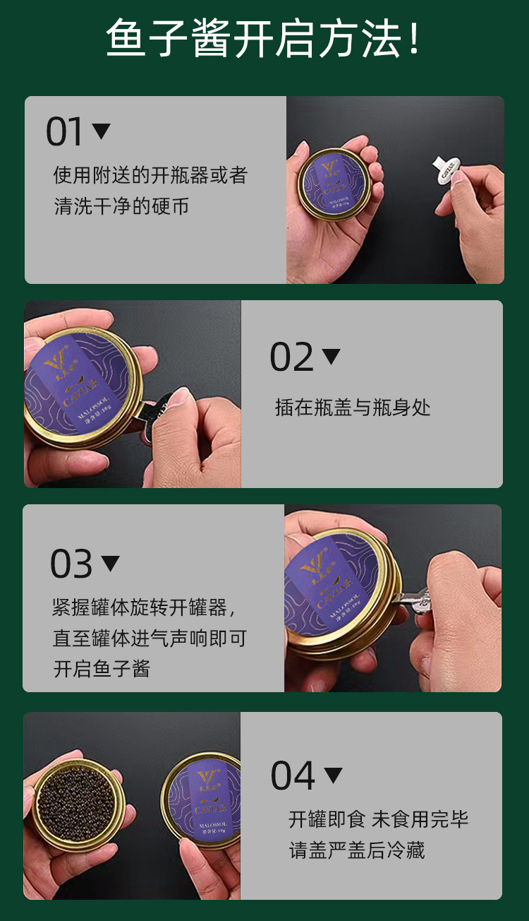 | Вкус: | 1 банка осетровой Roe (10G), 2 банки осетровой икры отдаются [Can Opener + Shell Spoon], 4 банки осетровой икры [подарочная коробка], 4 банки осетровой икры |