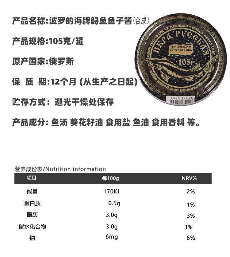 Русская икра оригинальная бутылка Импортированная бутылка для семян лосося для семян