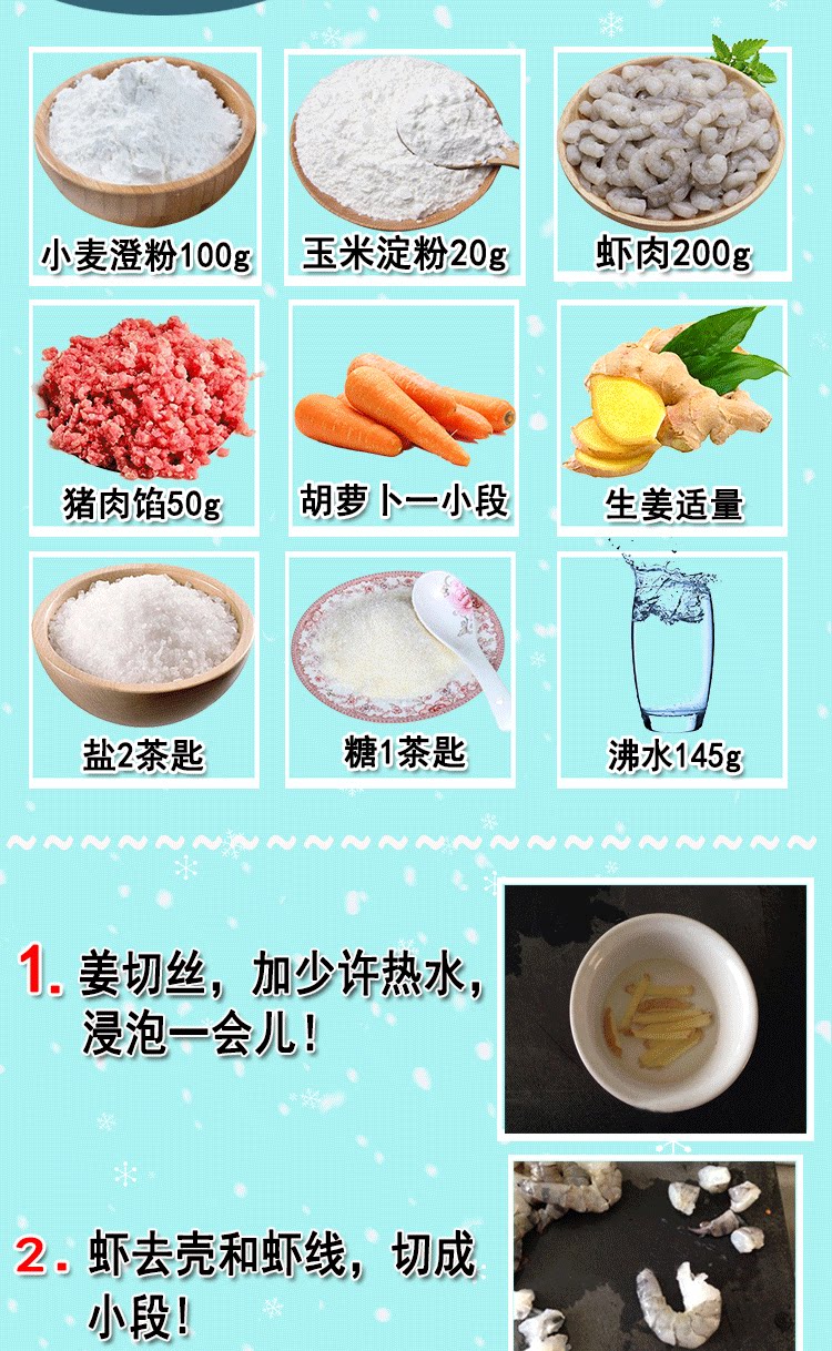 450 граммов порошка Ченга, 50 граммов крахмала, 125 граммов креветок, 125 граммов сушеного бамбукового побега, 90 граммов сала, соляного монозодий глутамат, сахар, кунжутное масло, перец и перец.