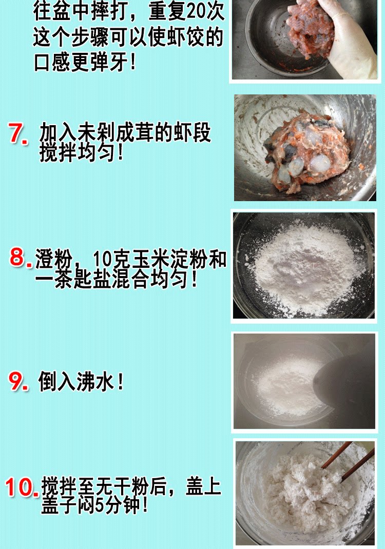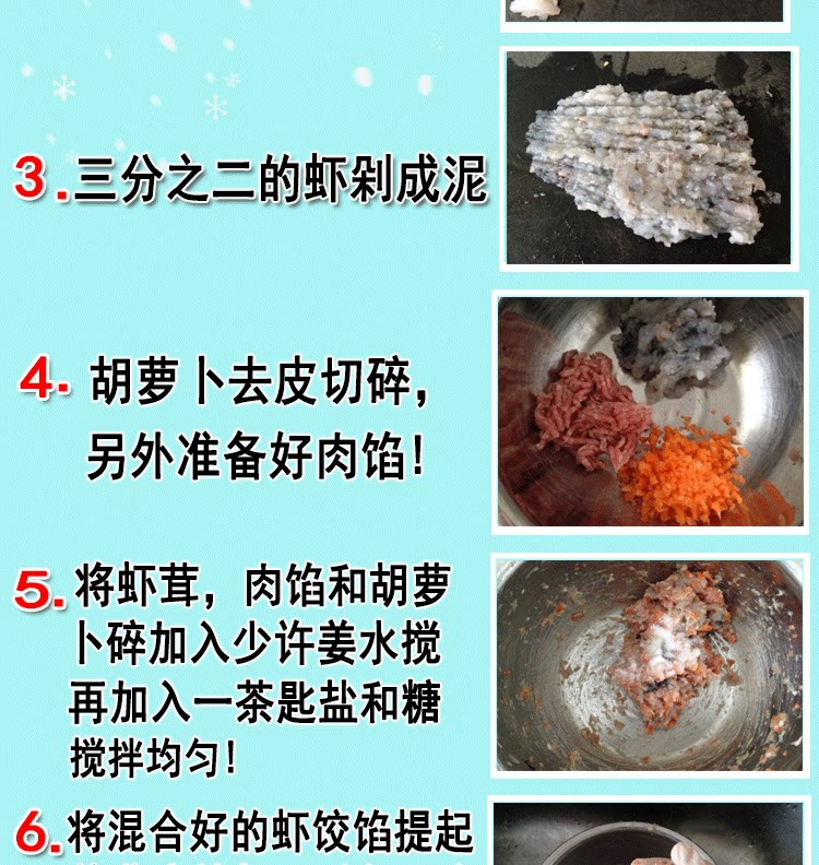 3. Добавьте соль в креветки, запеченные и перемешайте. Положите приготовленное мясо креветок, жирное мясо, измельченный лук, глутамат монозодий, сахар, кунжутное масло и т. Д., Поместите в холодильник и заморозить;
