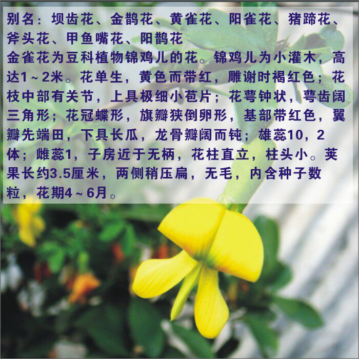 Этот вид дрока также известен какполоска с желтыми шипами, дляКараганаКрупный, средне-вертикальный рост.кустарник, до 2 м высотой, со тонкими и голыми ветвями, ложно-небной формы.Составной лист,Листовой валКороткие, с острой верхушкой, листочка 4, твердая бумага, весь край, цветки обоеполые, преимущественно одиночные.СтеблиЦветки тонкие, посередине сочлененные, ярко-желтые.Тычинка10 штук, 2 корпуса (9+1).Стручки цилиндрические, слегка плоские, при созревании раскалываются с обеих сторон.чиститьПовернуть.