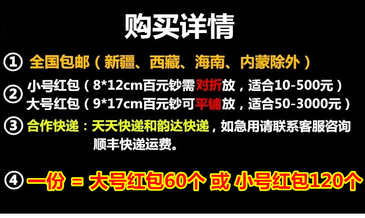 | Технические характеристики: | 120 маленьких красных конвертов (сложенная банкнота), 60 больших красных конвертов (банкнота хранения), 60 маленьких красных конвертов (складываться), 30 больших красных конвертов (банкнота банкнота) |
