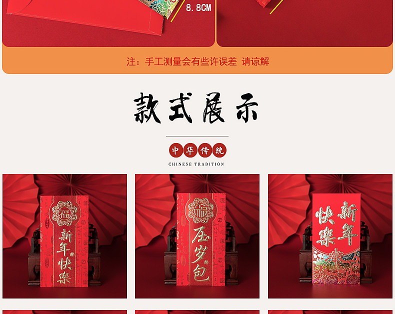 Размер тысячи юаней красных конвертов составляет около 9x17 см, что поддерживает 100 юаней.Максимум 4000 может быть размещено.Размер 100 юаней красного конверта составляет около 8x11 см.Пакет - это все 6 нарядов!Пожалуйста, обратите внимание на размер!