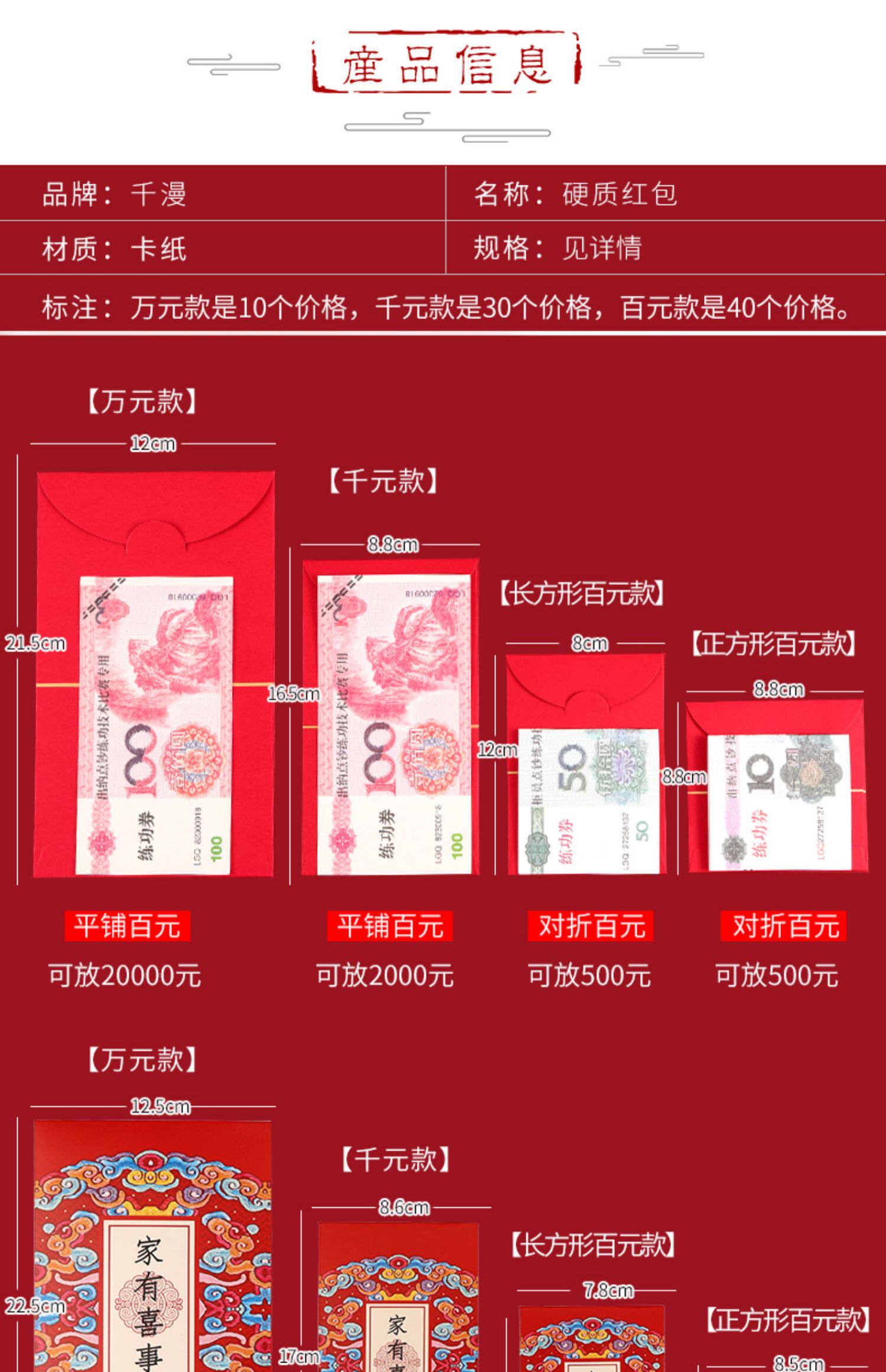 | Технические характеристики: | Сто Юань в квадратах [30 установок], Прямоугольный 100 юаней [30 установок], Тысяча юаней красных конвертов [30 установок], 10 000 юаней красной конверт [6 установки], Мини -красный конверт [40] мягкий, Другие стили |