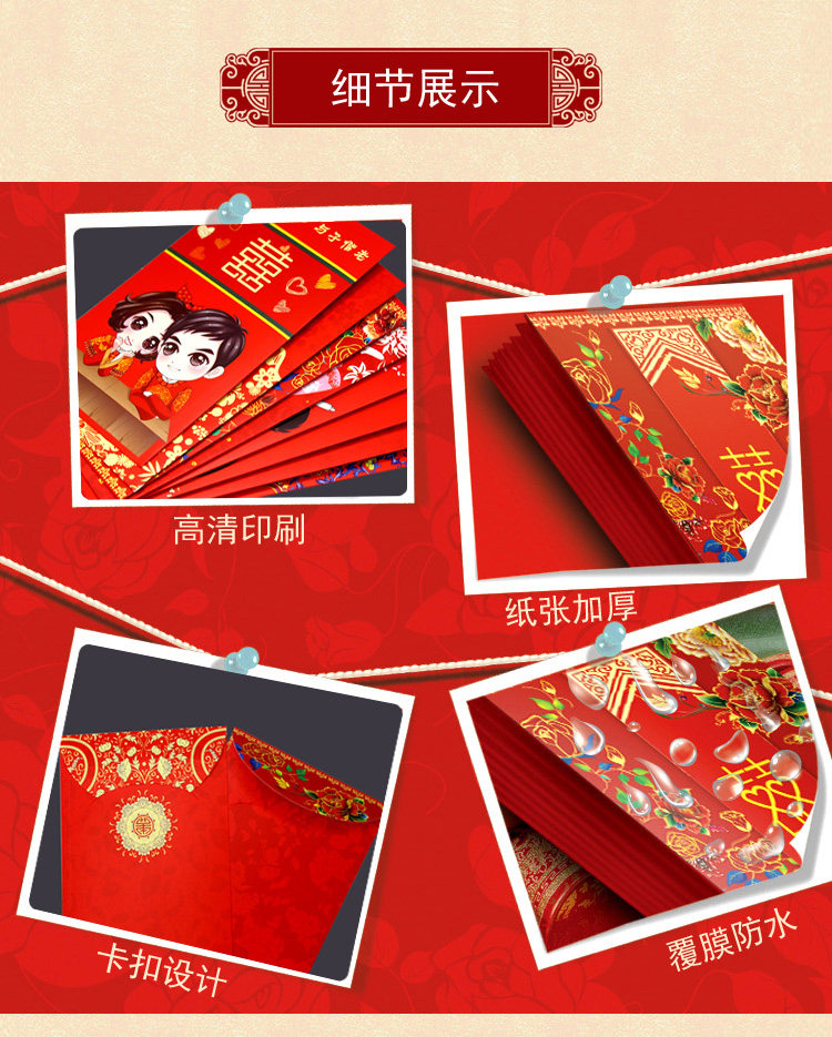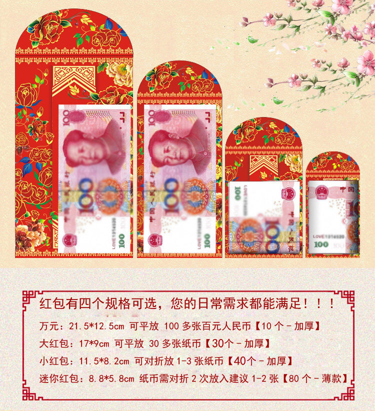 | Технические характеристики: | Тонкие мини -красные конверты [120], Толстый красный конверт [40], Толстый красный конверт [30], Толстый 10 000 юаней красный конверт [5] |