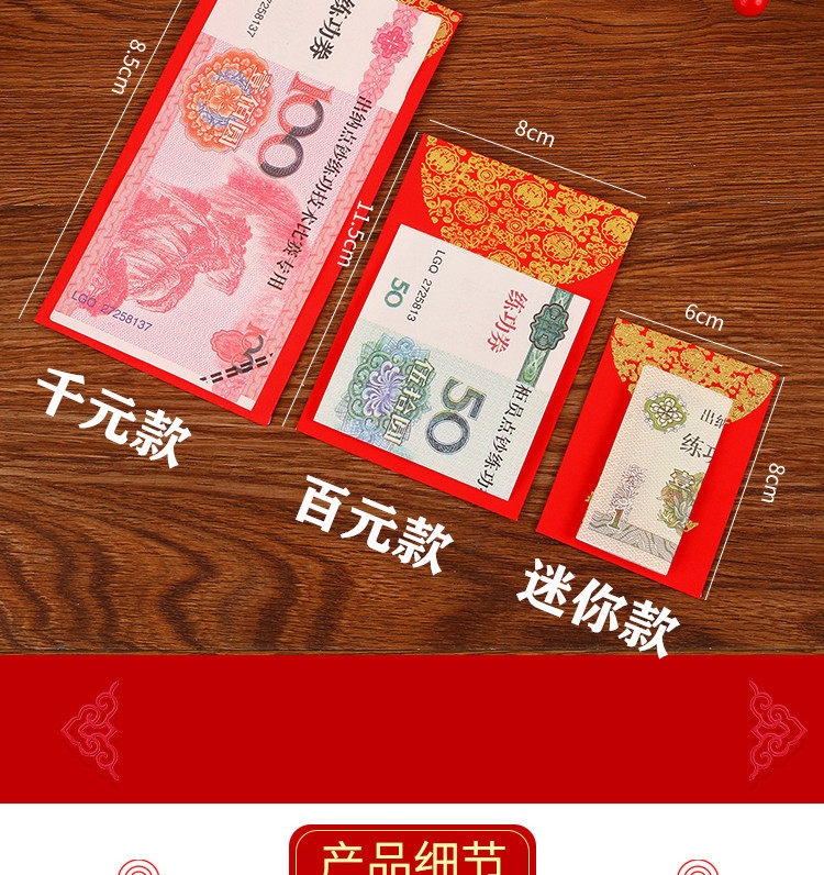 | Технические характеристики: | Мини -красный конверт [45], 100 юань красный конверт [6], Тысячи юаней красной конверты [6], 10 000 юаней красный конверт [6] |