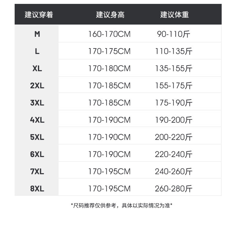 | Размер: | М рекомендует 90-110 фунтов, L рекомендовал 110-135 кот, XL рекомендует 130-155 кот, 2xl рекомендуйте 155-175 кот, 3xl рекомендуется 175-190 кот, 4xl рекомендуется 190-200 кот, 5xl рекомендуется 200-220 кот, 6xl рекомендуйте 220-240 Catties, 7xl рекомендуйте 240-260 кот, 8xl рекомендуется 260-280 кот |