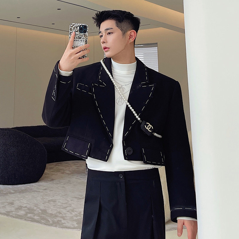 Брендовый черный короткий костюм, дизайнерская куртка, осенний, тренд сезона, изысканный стиль