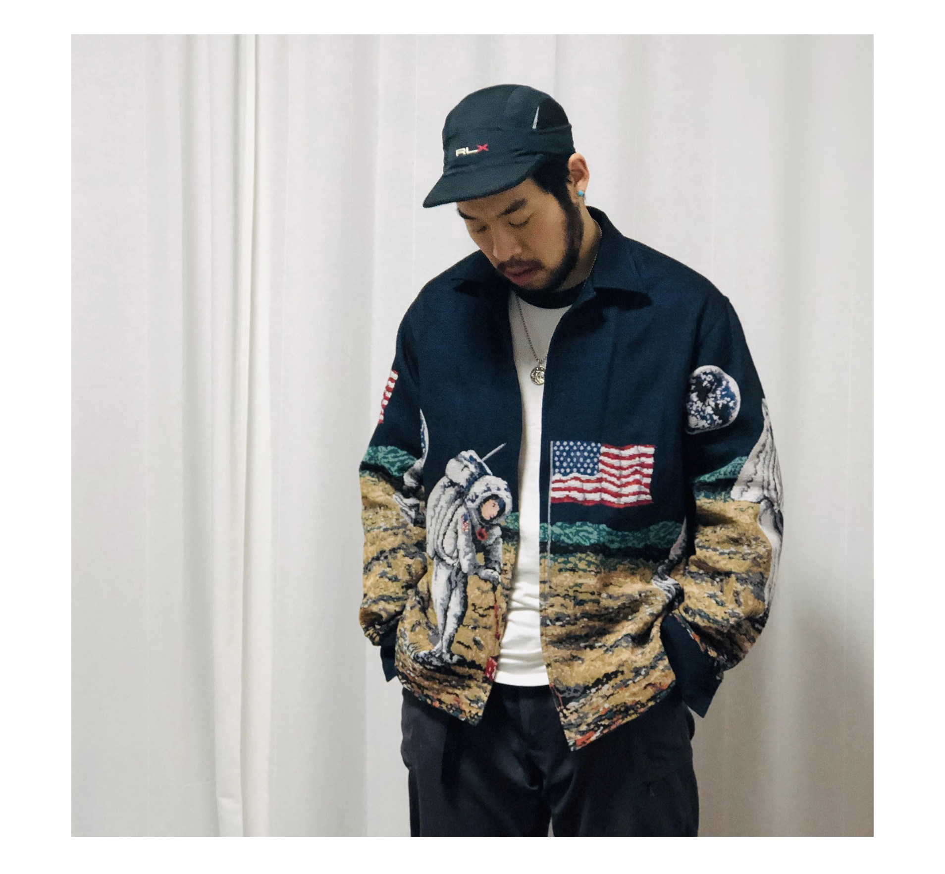 Уличная трендовая куртка-рубашка из окрашенной в пряже ткани UTD на тему высадки на Луну