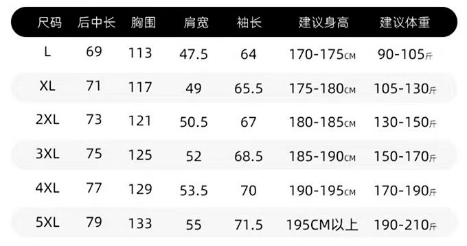 | Размер: | L предложил 90-105 кот, Xl рекомендуется 105-130 кот, 2xl предложение 130-150 кот, 3xl Предложение 150-170 Catties, 4xl предложение 170-190 кот, 5xl Предложение 190-210 Catties |