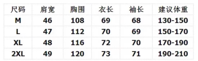 | Размер: | М рекомендуется быть около 150 кот, L предложил 150-170 кот, XL рекомендовал 170-190 кот, 2xl предложение 190-210 Catties |