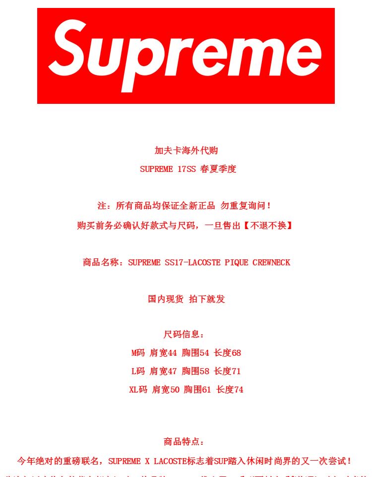 Supreme SS17-Lacoste Pique Pique Crewnec Ring Crucade Crusade