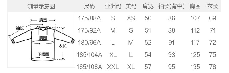 | Размер: | 175/88A Азиатский код (ы)/США код (XS), 175/92A Азиатский код (M)/США код (ы), 180/96A Азиатский код (L)/США код (M), 185/104A Азиатский код (XL)/США код (L), 185/108A Азиатский код (XXL)/США код (XL) |