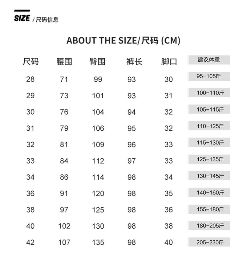 | Размер: | 28. Можно носить от 95 до 105 фунтов., 29. Можно носить от 100 до 110 фунтов., 30. Можно носить при весе от 105 до 115 фунтов., 31 110 ~ 125 Catties можно носить, 32. Можно носить при весе от 115 до 130 фунтов., 33. Можно носить при весе от 125 до 135 фунтов., 34. Можно носить при весе от 130 до 145 фунтов., 36. Можно носить при весе от 140 до 160 фунтов., 38. Можно носить при весе от 155 до 180 фунтов., 40. Можно носить при весе от 180 до 205 фунтов., 42. Можно носить при весе от 205 до 230 фунтов. |
