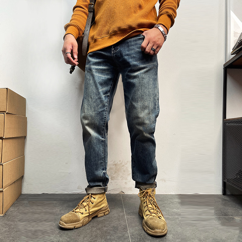 11717 Американские ретро -ретро -мужские приливы тяжелые рабочие вода для мытья старые трехмерные режущие кошки должны быть призванными белыми маленькими прямыми джинсами