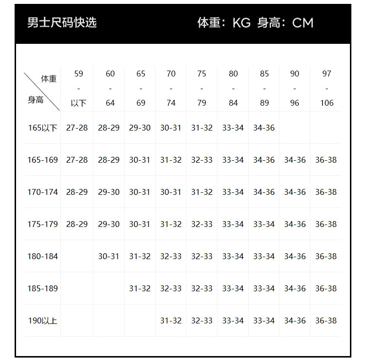| 190/92A(W38/L34) | W38/L34 | 113 | 103 | 121 | 72 | 35 |