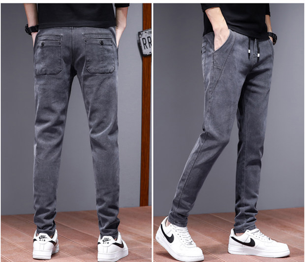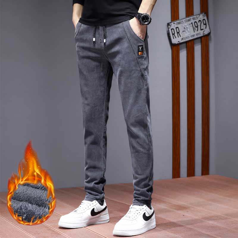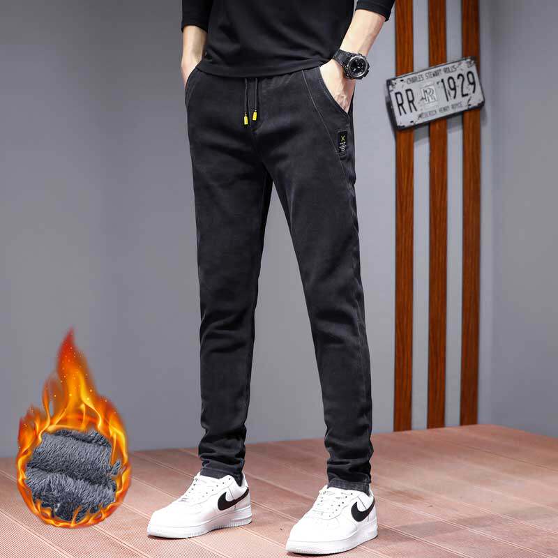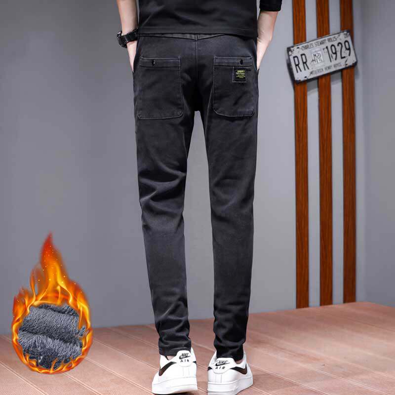 Зимние утепленные эластичные джинсы, штаны, облегающий крой, эластичная талия, свободный прямой крой, в корейском стиле