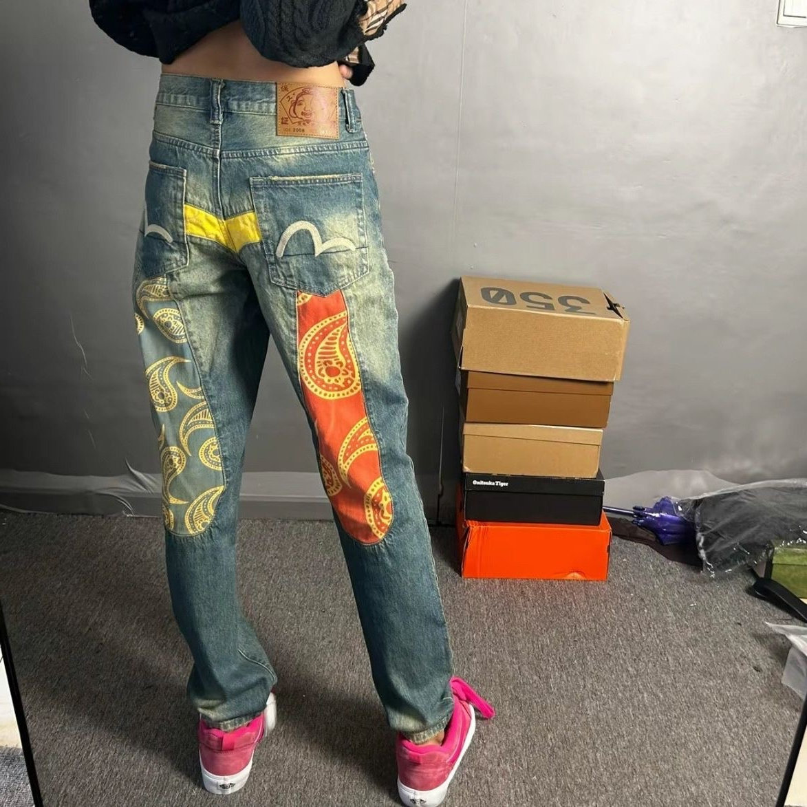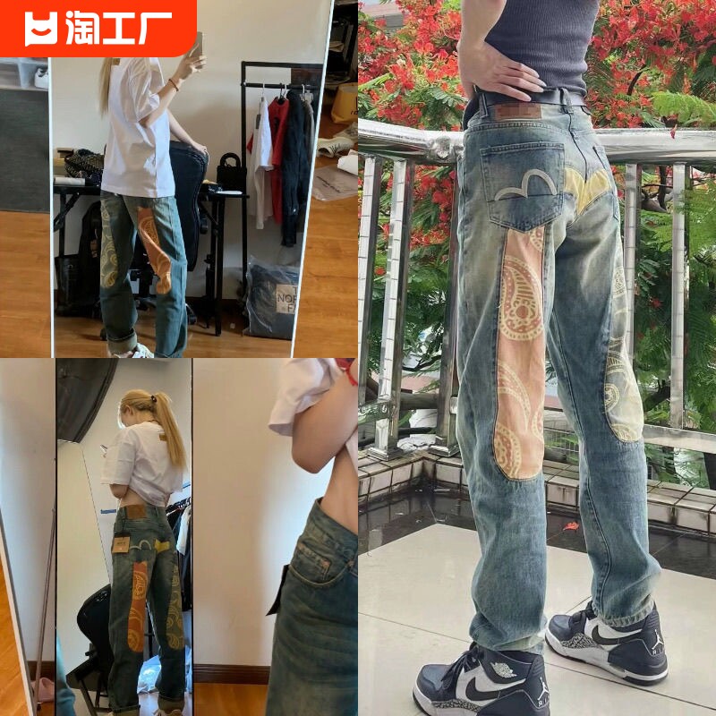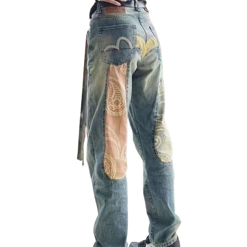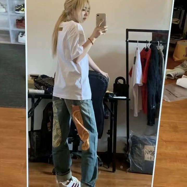 Джинсы, штаны, с вышивкой, свободный прямой крой, популярно в интернете