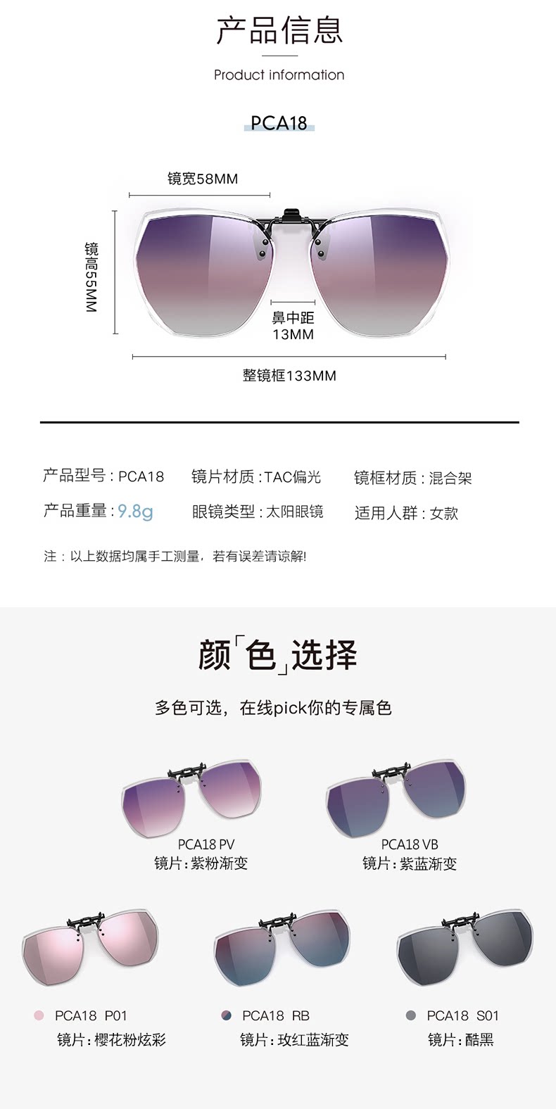 | Цвет: | PCA18-S01 Cool Black Polarization, PCA18-PV Purple Powder Gradient Polarization, PCA18-VB Purple Blue Gradient Polarization, PCA18-RB Rose Red и Blue Gradient Polarization, PCA18-P01 Blossom Blossom розовый красочный поляризатор, PCA21-PV Поляризованный фиолетовый порошковый серый градиент, PCA21-VB Поляризованный фиолетовый градиент орхидеи, PCA21-PV1 Поляризованный фиолетовый порошковый серый градиент |